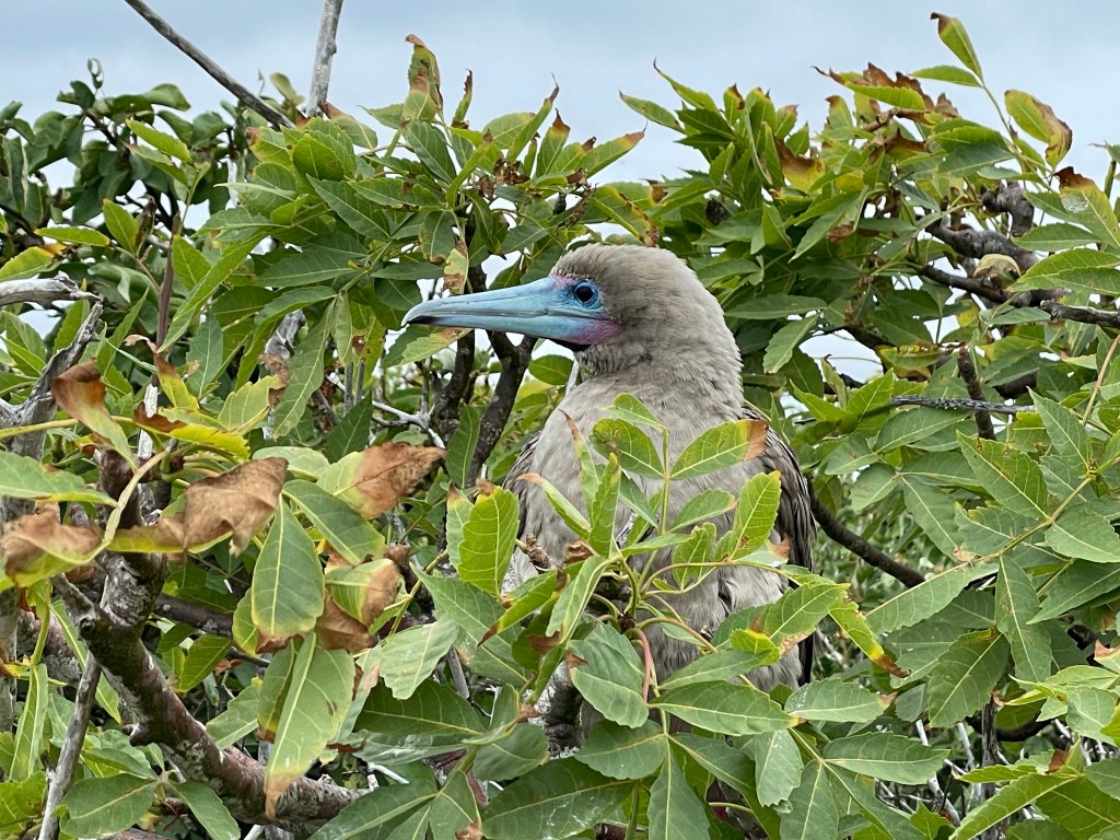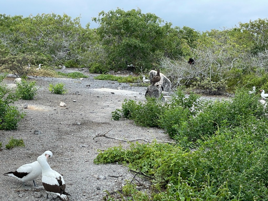 Frigates lounged in the shrubby trees, one male putting on a show trying to pickup on the ladies. Boobies and gulls nested on the ground. A juvenile swallow tailed gull hopped around inquisitively. It’s so fascinating how the animals in the Galápagoss are so protected and the islands so tightly regulated (thank you national parks!) that they do not have a natural fear of humans. Looking at the fuzzy down on the little gull I asked Andreas the Spanish word for “fuzzy.” Apparently it’s not a word that translates well and he settled on “suavacito.”