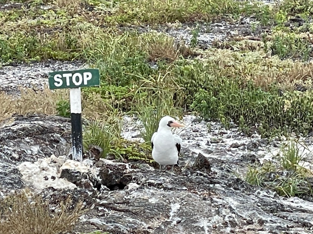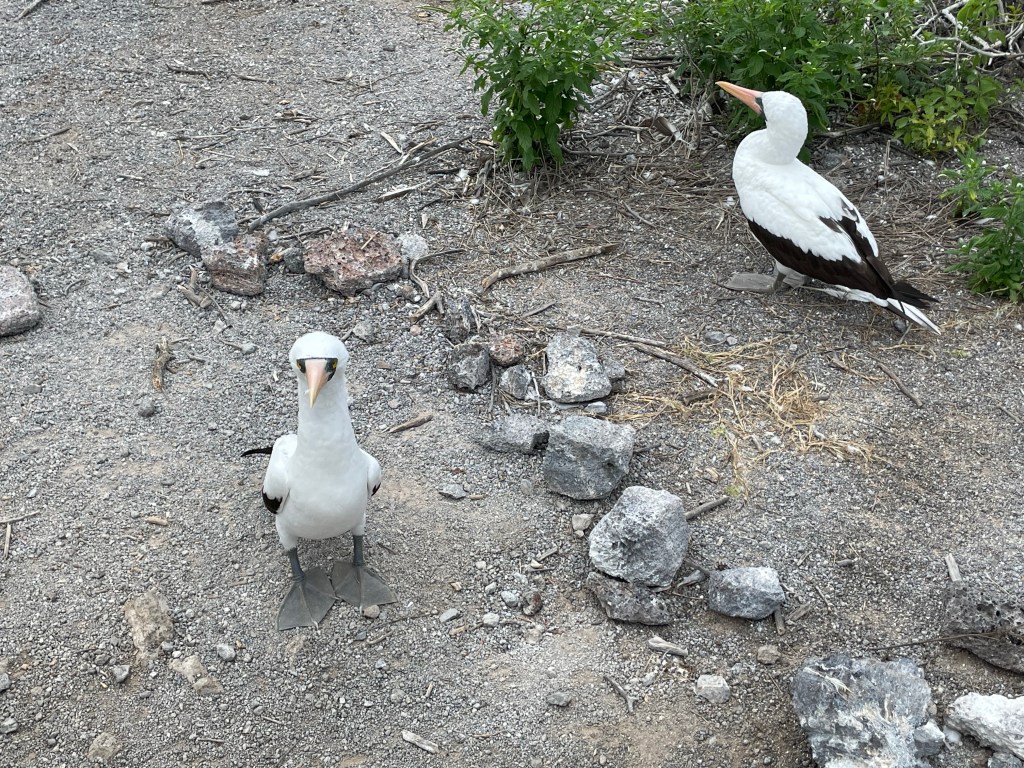 Two guides serve the yacht and Andreas was my guide for this excursion. For each excursion us yachters were broken up into two groups of no more than 10-11 together at a time. Genovesa is a super bird sanctuary where all three types of boobies (red-footed, blue-footed, and masked) could be found alongside frigates (both great and magnificent), short-eared owls, and more. During the short panga ride to the island a sea turtle popped his head up right beside us, as if to wish us “buenos dias” before diving back down. As soon as we reached the top of Prince Philips steps the group was immediately greeted by birds all around. Curious masked boobies waddled over to see who had come onto their island. Apparently they were named boobies by the Spaniards because they are such a curious and goofy bird and it’s so true!