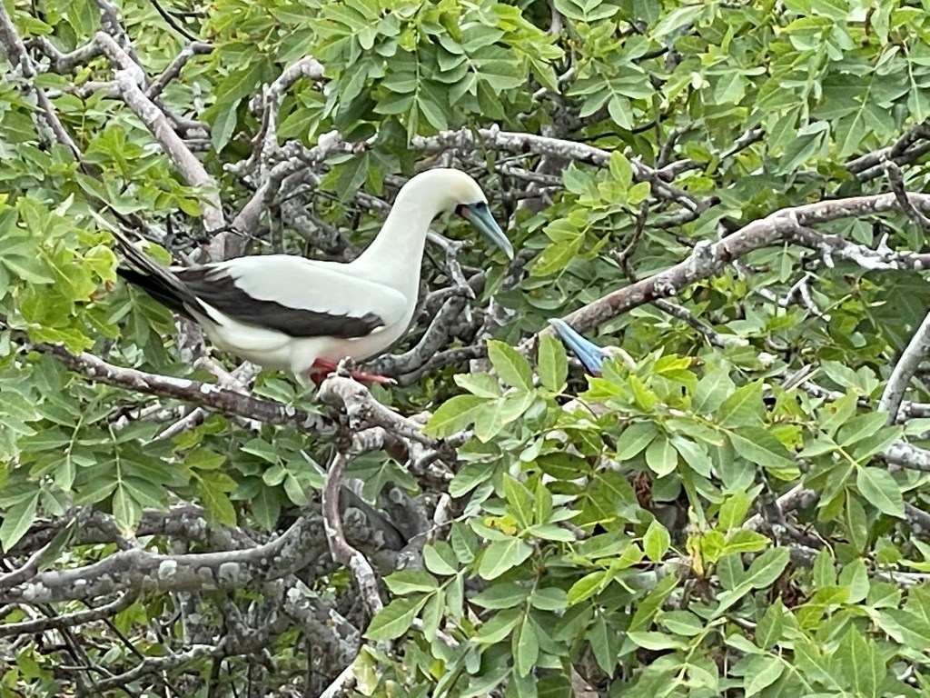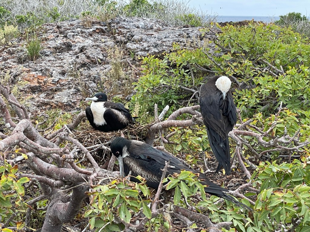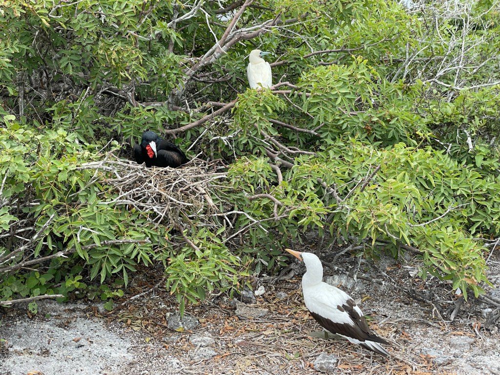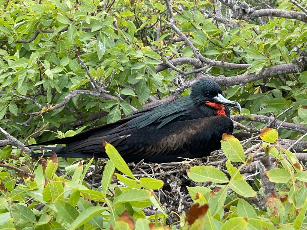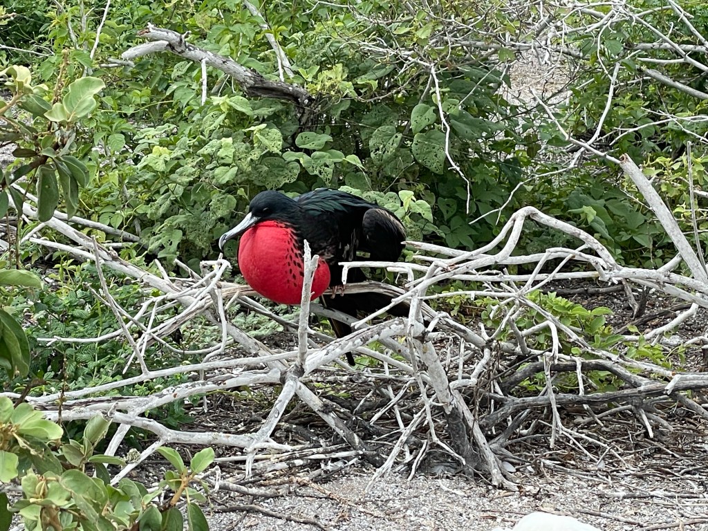 Great frigate males showed off their finest attributes, with their red chest pouches extended. Male frigates pick up on the ladies by displaying their beautiful pouches. It can take up to six days for them to fully inflate when the mood strikes and once inflated they rarely flew. The bigger and brighter the pouch, the more attractive the boy. Throughout the hike there were innumerable displays of the red pouched show-offs and the ladies, with their white heads and no colorful pouch, checking them out.