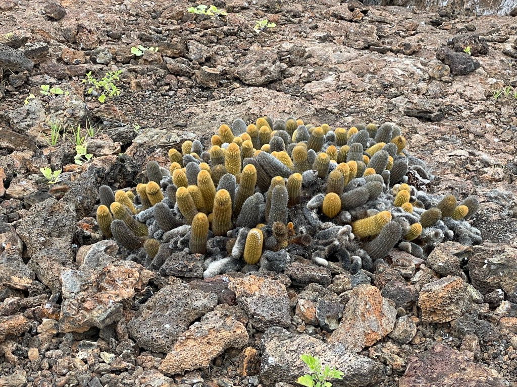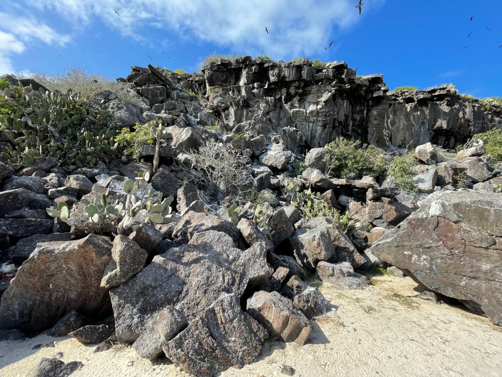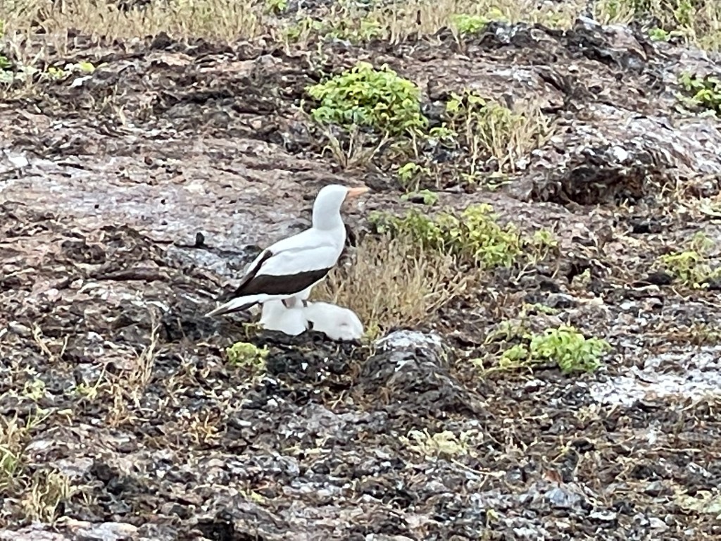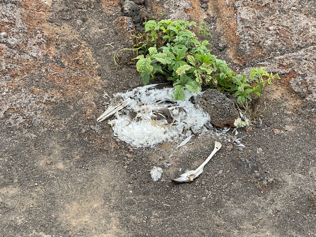We walked by a boobie sitting on her egg but moved quick and did not linger to take a pic as to not interrupt her. A little further off a fluffy white baby boobie cuddled up to a parent. Andreas was a wealth of knowledge on all the birds and the ways they had to adapt or die. I was learning so much on this hike and I was soaking up every factoid that I could. An open lava field on the edge of the island was a bit of a birdie graveyard, showing the remains of smaller birds, petrals, that had been eaten by owls and boobies who had not done a good job learning how to boobie and basically concussed themselves to death failing to properly dive into the water or land on solid ground. Phallic lava cactus occasionally dotted the field of basaltic lava and bones.