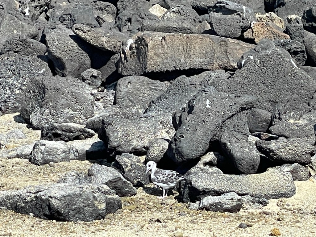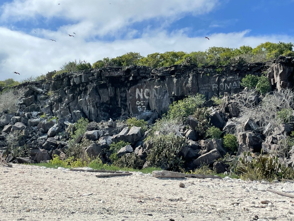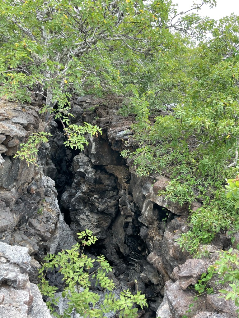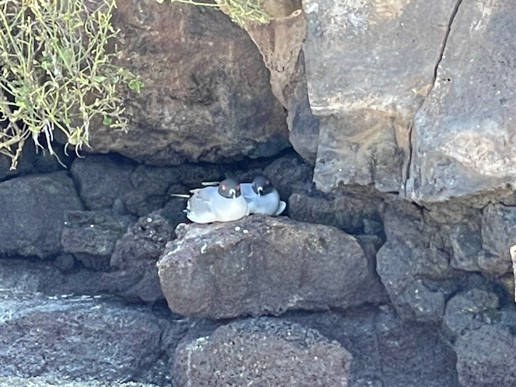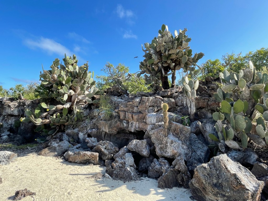 We walked by a boobie sitting on her egg but moved quick and did not linger to take a pic as to not interrupt her. A little further off a fluffy white baby boobie cuddled up to a parent. Andreas was a wealth of knowledge on all the birds and the ways they had to adapt or die. I was learning so much on this hike and I was soaking up every factoid that I could. An open lava field on the edge of the island was a bit of a birdie graveyard, showing the remains of smaller birds, petrals, that had been eaten by owls and boobies who had not done a good job learning how to boobie and basically concussed themselves to death failing to properly dive into the water or land on solid ground. Phallic lava cactus occasionally dotted the field of basaltic lava and bones.
