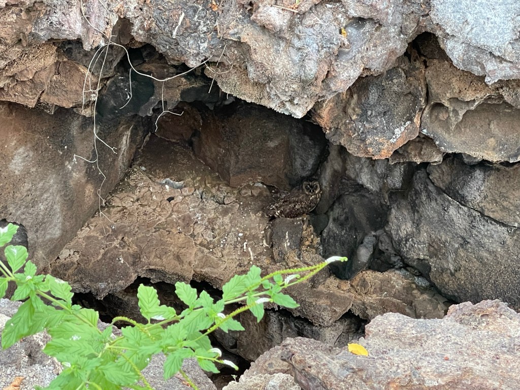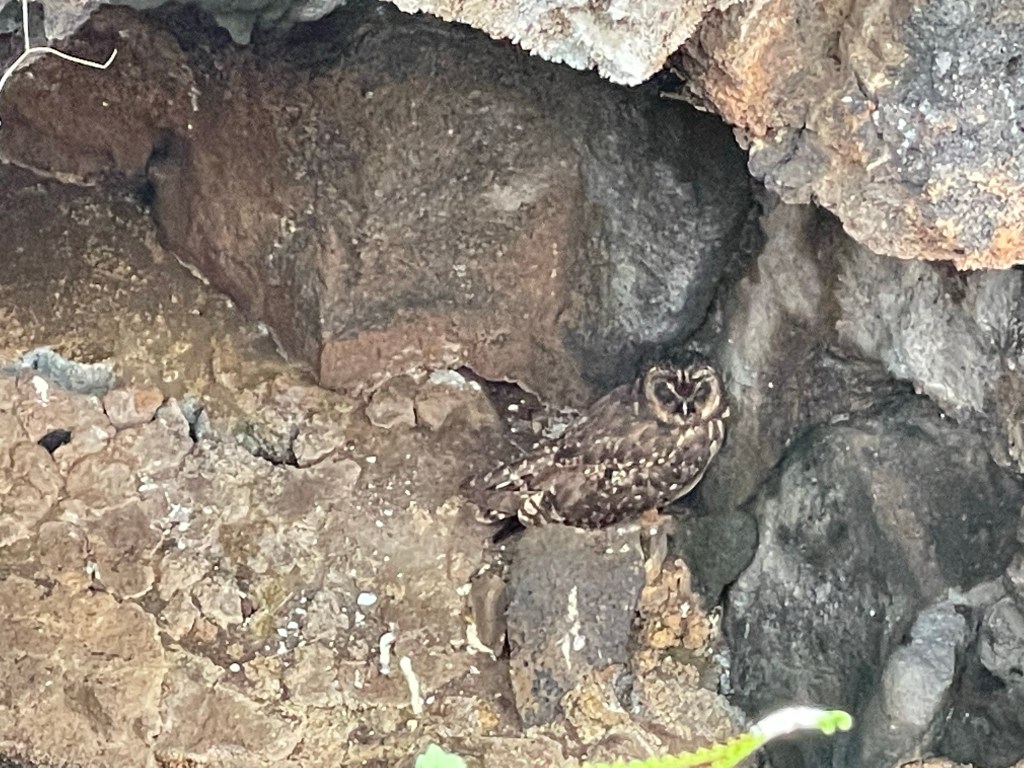 Andreas led us past a fissure in the ground and I startled with excitement; a short-eared owl was on full display tucked into a little shelter in the wall within the crevice and amongst the surround palo santo trees. The owls were the hardest to spot on the island so I had tried to temper my expectations and knew that I might not see one but here it was! The fissure was created as in this area the two tectonic plates beneath the surface were moving apart and the ground was sinking.