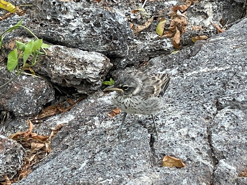 Trying not be so upstaged by the boobies and frigates, a mockingbird put on a show trying to eat a giant caterpillar while another juvenile fledgling, soft with down, watched us curiously from the side of the trail. The visit to this side of Genovesa was a full circle of life experience from breeding to death, and everything in between.