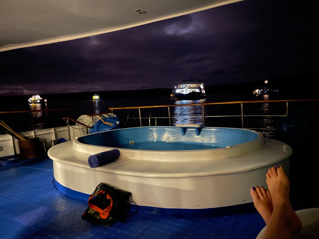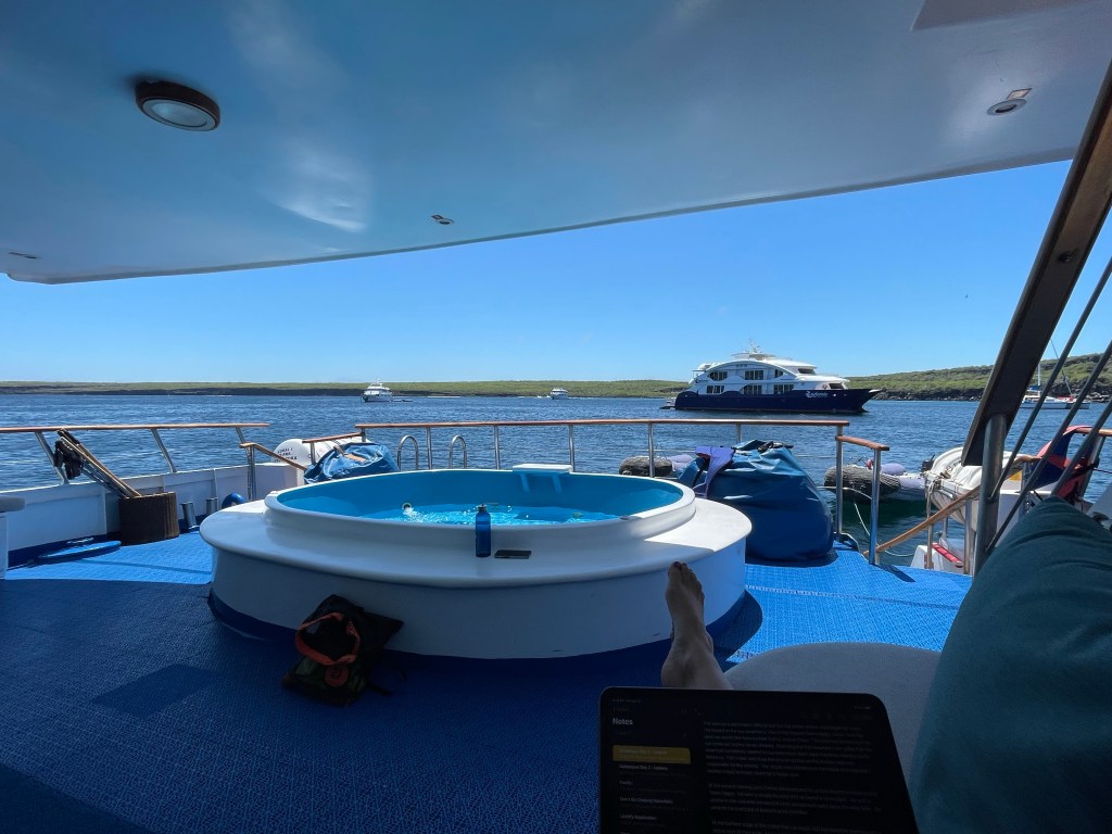 My iPad and I tucked into what was becoming my little corner on the jacuzzi deck. I just wanted to sit and write. I really needed some quiet time. I didn’t mind being in the presence of others but but I needed a break from interacting. Spending so much time with others is exhausting for my introverted empathic soul. I had a few minutes to recharge and then quickly ended up back in conversation with my new friends. Yes, I could have tucked into my room but I wanted to enjoy the outside and a few minutes was enough to catch my breath and be ready to interact again.