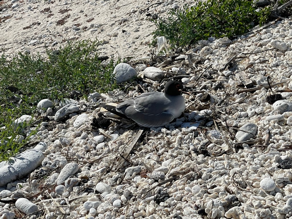 After a rest on the yacht it was time go grab our snorkel gear bags and climb back onto a panga for a wet landing at Darwin’s Bay, on the opposite side of the submerged crater from Prince Philip’s steps. Lazy sea lions opened one eye and gazed at us as we strode onto their beach. Camilo pointed out a little hermit crab crawling between the rocks. A baby sea lion came out of the water, calling for its mama. She responded and it went running to her, as fast as its little flippers could go, to nurse. I don’t know that I’ve ever seen a more tender moment in nature in my life. Mama rolled back and forth, stroking her baby with her flippers while baby had it’s lunch. I could hear the baby suckling with enthusiasm. Another sea lion seemed jealous of the attention and rolled around seemingly trying to to annoy the nursing mama and put on a show for us. As we watched this tender demonstration, Andreas provided more facts about sea lions. Did you know that they will actually eat rocks to make themselves heavier so they can dive deeper into the water? Swallow tailed gulls hopped around and flew overhead as mama tended to her sweet baby. These gulls are most active and search out their meals after dark.