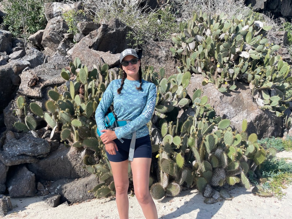 Graffiti covered portions of the cliff side and Andreas explained that sailors, buccaneers, and pirates would mark the islands with the name of their vessel and the year they visited. This practice was prohibited once the islands were declared a National Park in 1959. Bright and fragile yellow cactus flowers popped from prickly pears. Cactus pears always remind me of my dad and how he used to pick them from a large cactus in our front yard when I was a young child. As I took a picture of one, Andrea (not to be confused with our guide Andrea, or her husband Andreas) asked if I’d like a picture of me with the cactus. Why not? I handed her my phone and young Camilo wanted to be the photographer, taking his time to compose a frame that he found satisfying. Getting to spend more time with their family throughout the day I was really enjoying them all; both Camilo and Sofia were both so respectful and inquisitive.