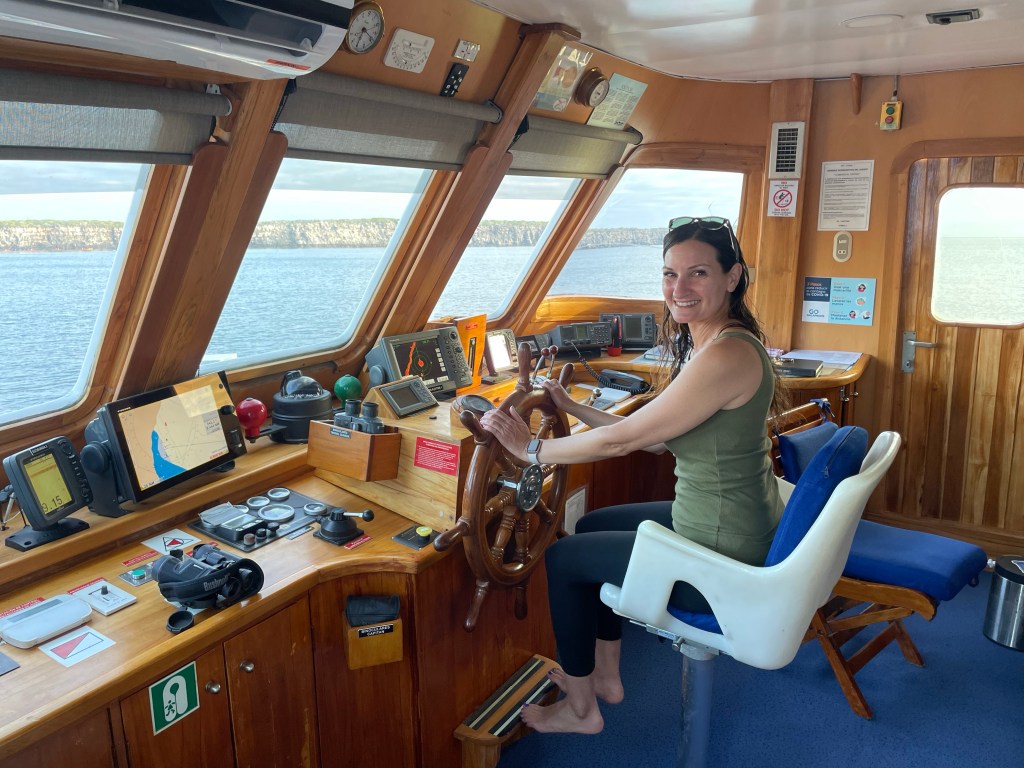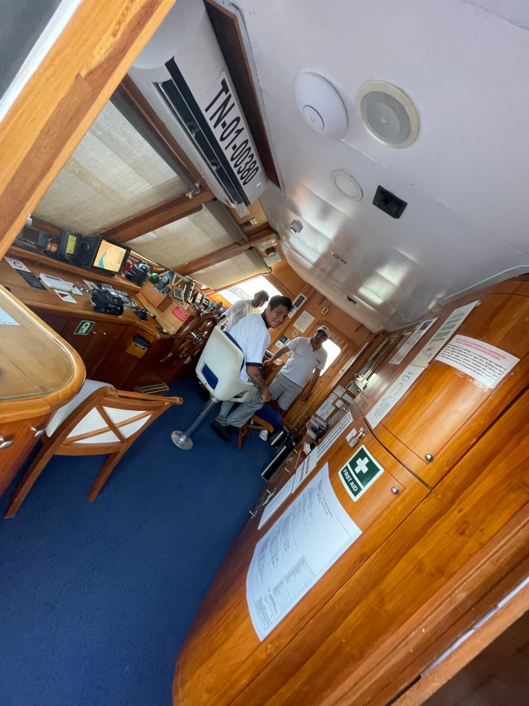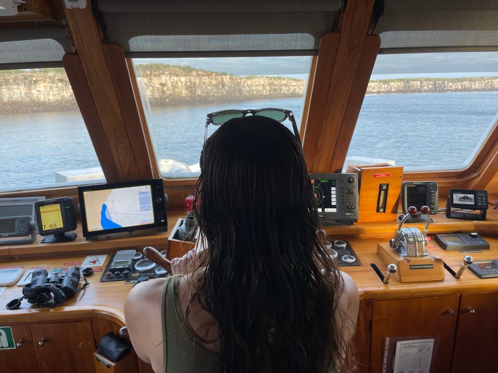 Warmed up and dry back on the yacht, I wanted to walk to the bow of the boat to take in the surrounding island and reflect on the day. Turning from my room, I found the door of the wheelhouse open and asked if I could peek inside. Chef Michael, Captain Manuel, and one of the crew were chatting. They invited me in and offered to take pictures of me; letting me know that I was welcome to come back when the boat was in motion tomorrow to see how everything works and try my hand at steering.