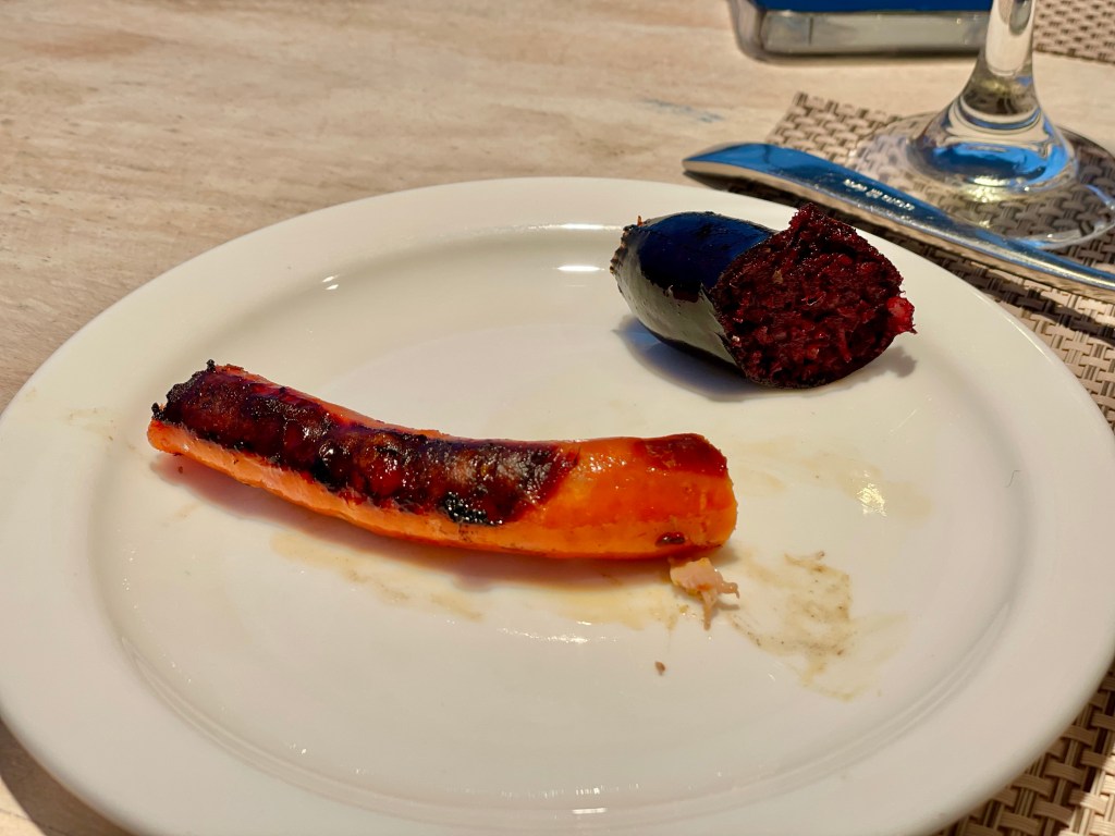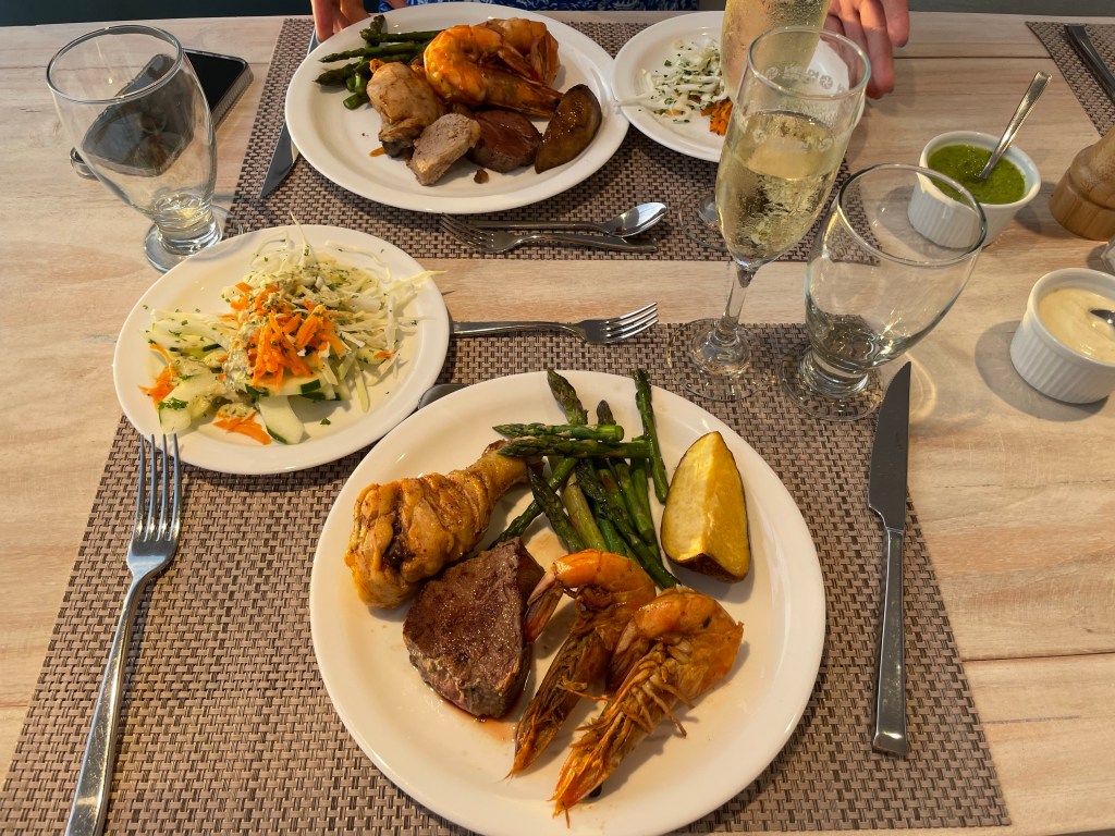 Tonight’s dinner was a luscious and extravagant bbq on the top deck. Chef Michael had grilled a ridiculous amount of meat including housemade pork and blood sausages, steak, chicken, pork chops, and prawns. Served alongside salad, asparagus, and potatoes; with tres leches cake for dessert. The tables were set with ramekins of queso and chimichurri sauces. Except for the pork chops I tried at least a little bit of everything and it was almost all divine. The only protein I didn’t like were the prawns, they seemed undercooked and the texture off. The chimichurri sauce was one of the best I’ve ever had. The pork sausage was definitely the best sausage I’ve ever had. I don’t even know that blood sausage is but I know that I liked it, except it was a bit salty for my taste.