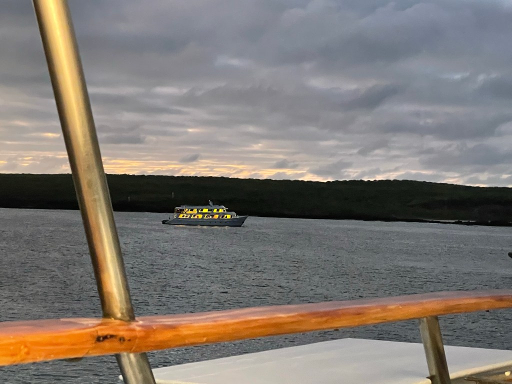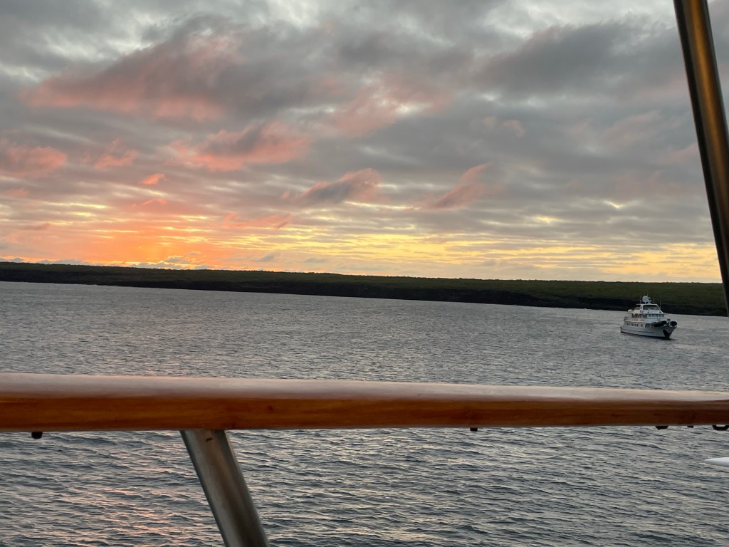 Immediately upon the conclusion of dinner I could hear the chain lifting the anchor and we were off for our overnight trek to Rabida. It was well after dark and as the boat moved on gulls flew alongside. After dinner I spent some time digesting and writing in my little corner before chatting in the company of friends and now here I am; tucked into my bed by 9:15pm. I haven’t had great sleep yet this trip and I am exhausted.