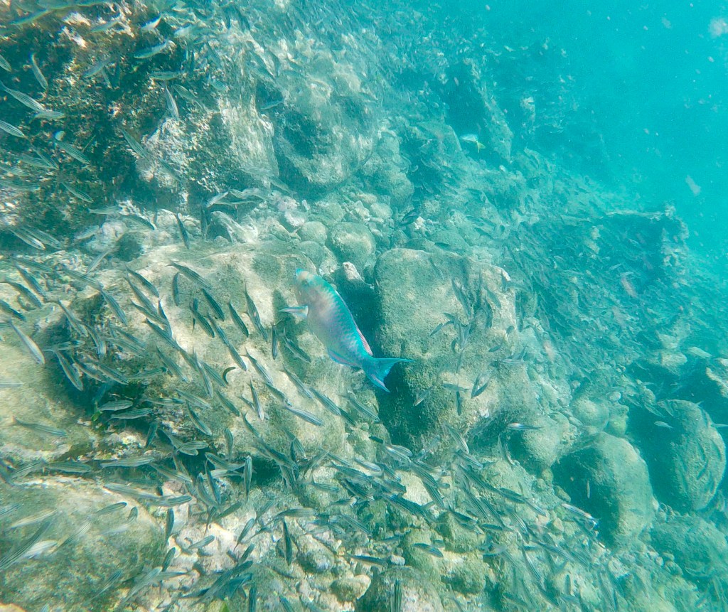 As I rounded a corner away from the beach I looked up out of the water to get my bearings and make sure I was headed in the right direction. Adam hollered at me, “Look down!!!” I immediately obliged, simultaneously starting recording as a white tip reef shark swam beneath me. So cool! I swam through schools of silver bait fish, sardines, little black and white striped fish; all unfazed by my passage.