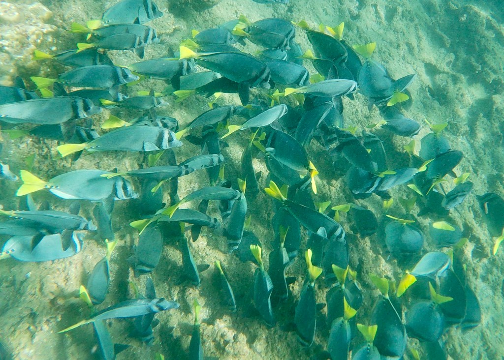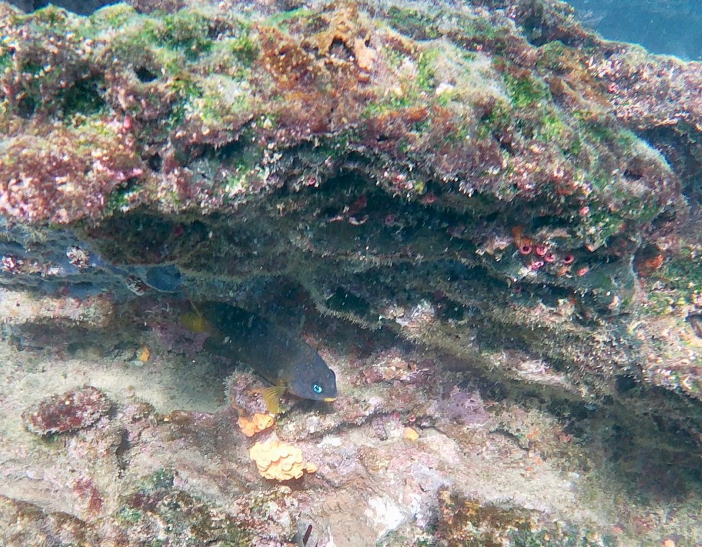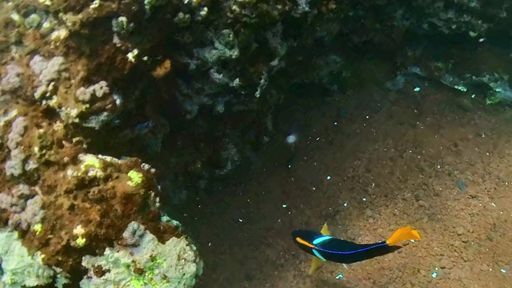 But I digress. With my wet suit on I backed my finned feet into the water, careful not to crush a lingering sting ray, and I was off. This time I had decided to take the GoPro instead of my Insta360 camera to get a feel for the different in quality. The water got deep quickly and almost immediately I was in a crevice between two large lava walls. A large school of yellowtail surgeonfish were unphased as I swam overhead. This was by far the clearest water I’ve been in this trip and the most diverse. Stately rainbow colored bluechin parrotfish swam by, star fish rested on the bottom, spiked and yellow aenomes dotted the lava.