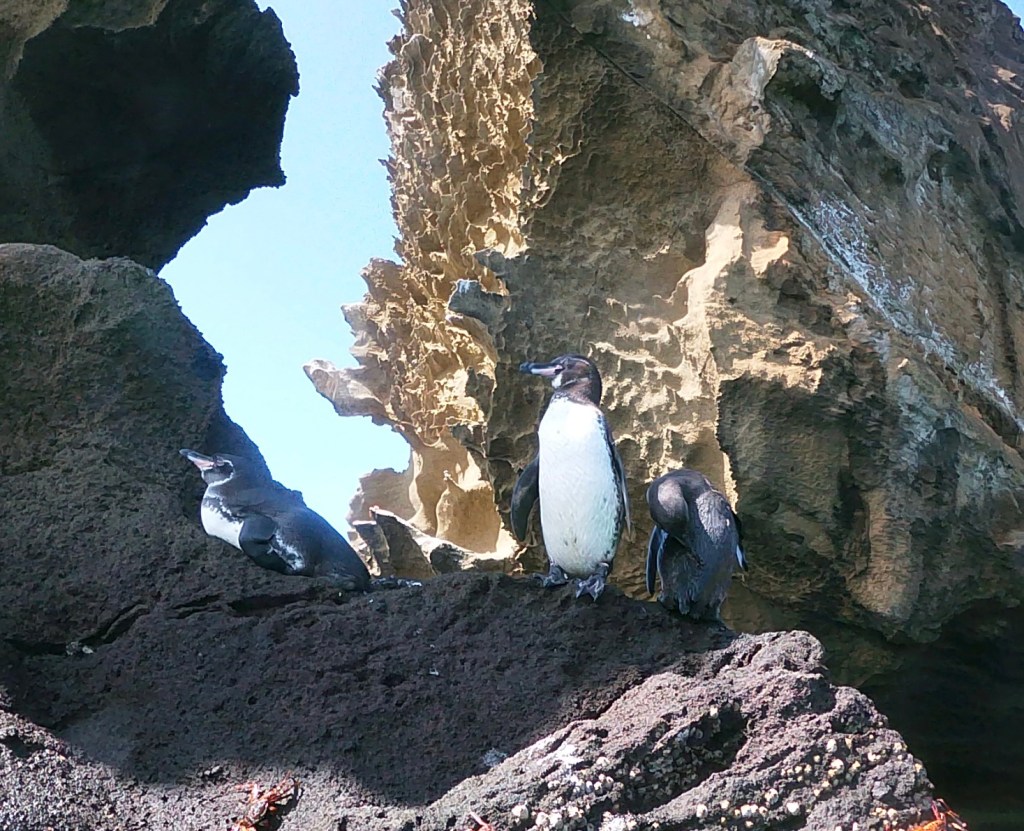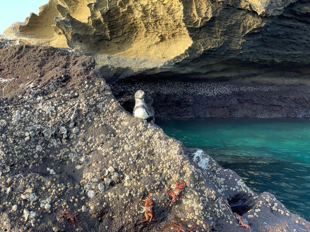 Before heading back to the yacht, it was time for a panga cruise along the coast of Bartolome. We stopped by our penguin friends that had joined me on my snorkel expedition and found more further down the island at their nesting area. It is not penguin baby season but this was also where the birds take shelter for the night. The lava flow on this side of the island had left magnificent little lava tube hollows that were perfect shelters and nesting sites for these waddling little cuties. It was a good lesson in how well they camouflage since everyone thought we were seeing two penguins on one little corner until our eyes acclimated and two more, flat against the rocks, started to come into view. The sun on the crystal clear water was as beautiful as the penguins.