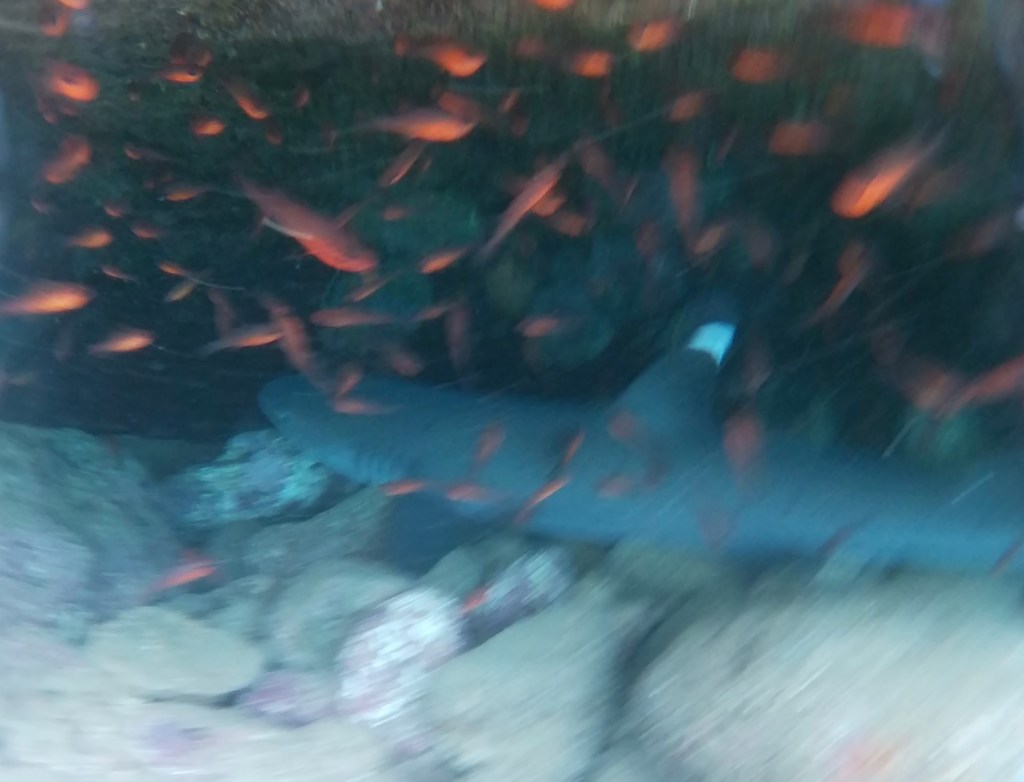 My penguin swim buddy was out of sight and I popped out of the water again. Adam and Audra were close by and called me over. Right under the penguin rock there was a little cave with another shark! Adam encouraged us to dive down Audra had tried and didn’t see it, and I don’t dive. I handed him the GoPro so he could snap a picture for us. Most of us on the yacht have already discussed that we’ll share pictures and footage with each other; especially those of us with underwater cameras. The picture may be a little fuzzy but you can see the whitetip clear as day!