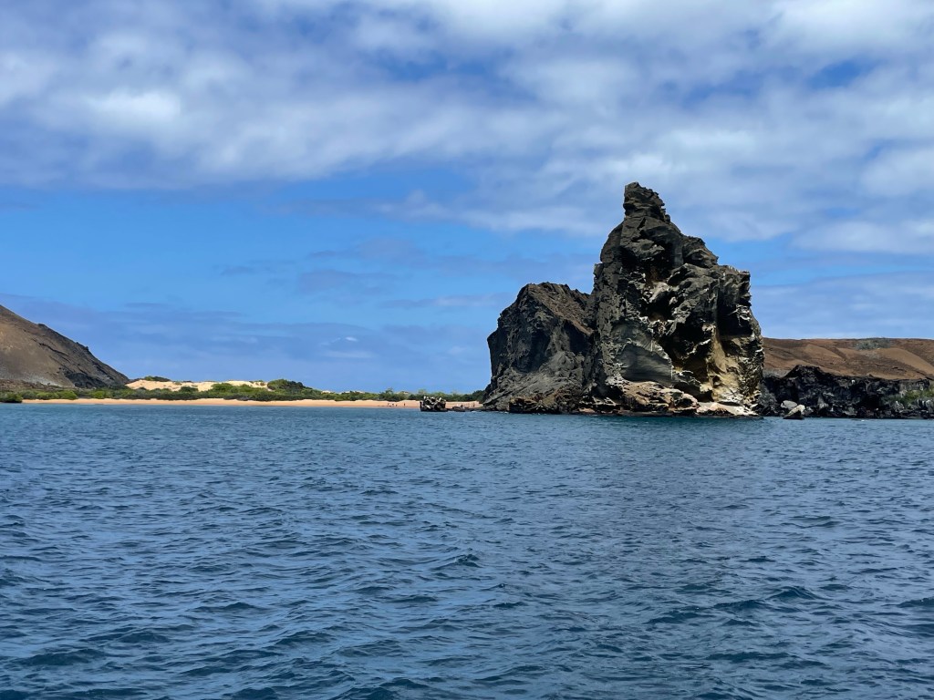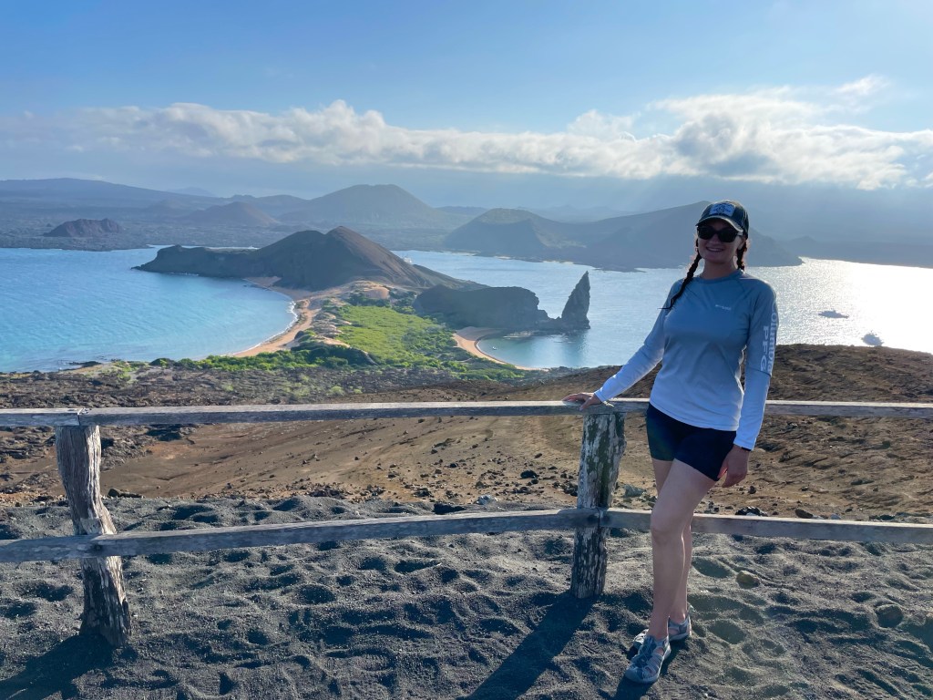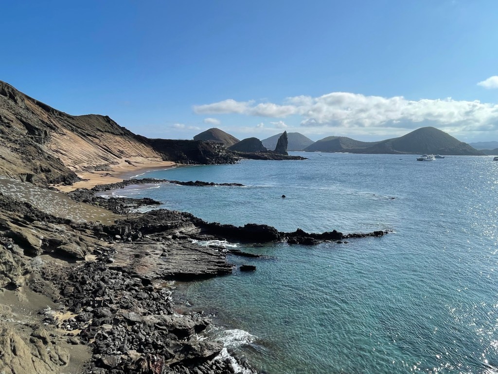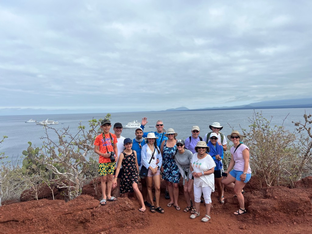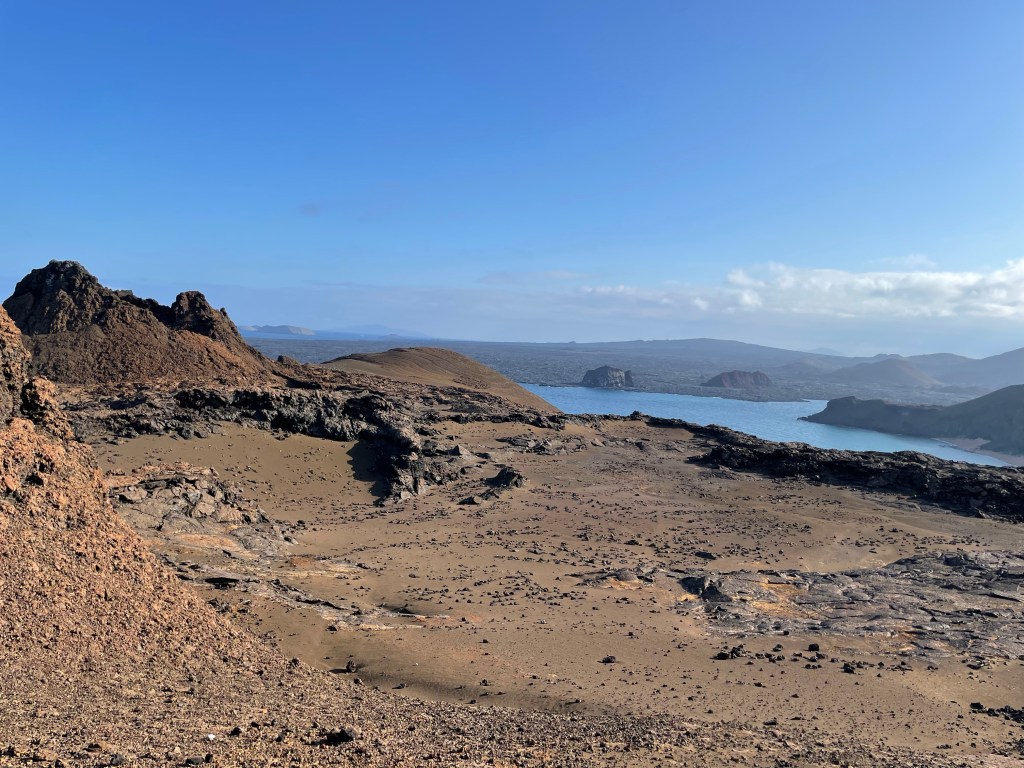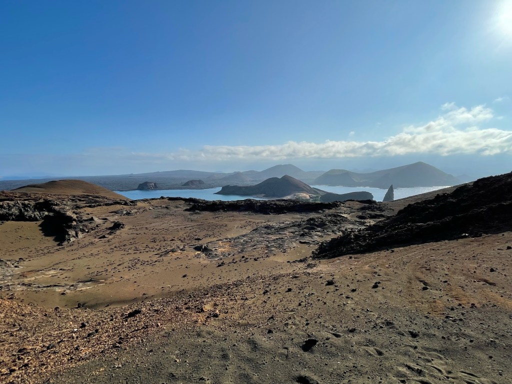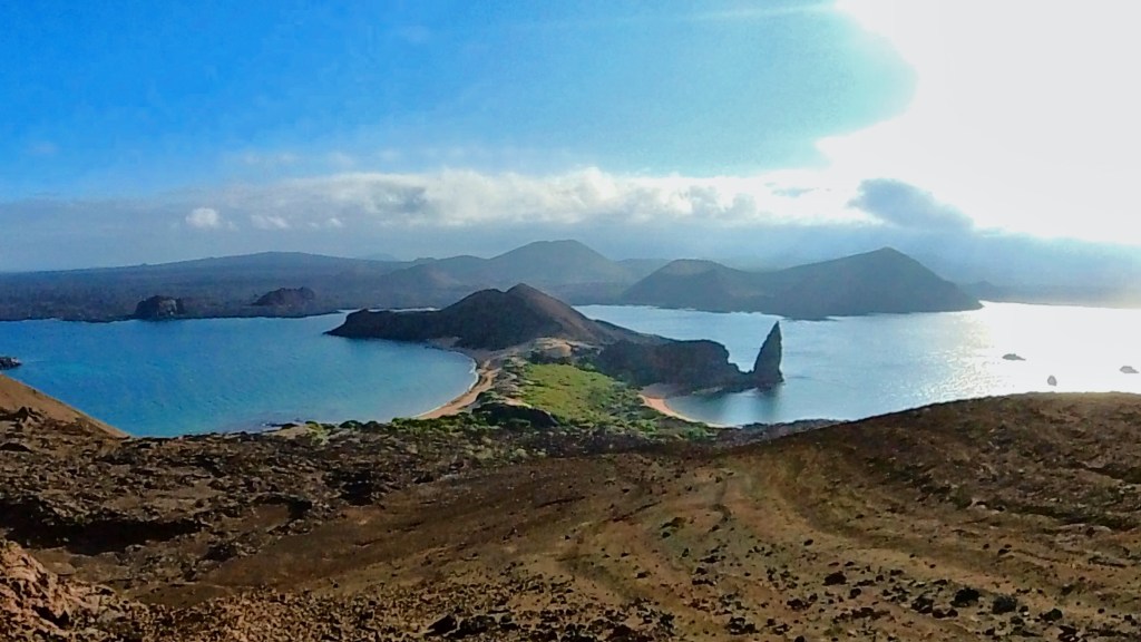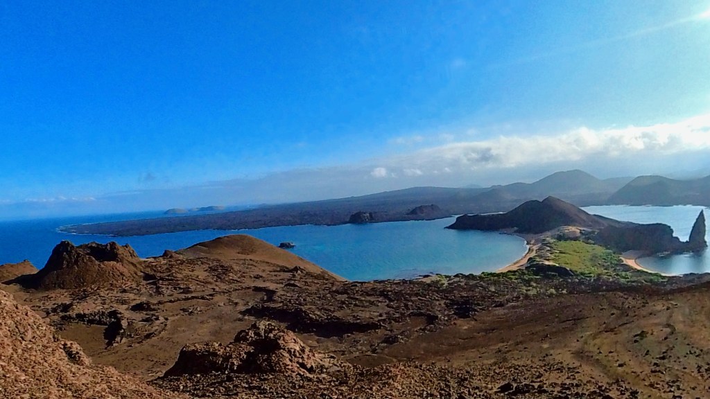 The top of Bartolome lived up to my expectations of the spectacular view. The air was a little hazy so it didn’t come out too clear in pictures but in person it was magnificent. I did take my Insta360 camera with me to experiment more with using that to capture the views so we’ll see how that comes out. Ali, a surgeon (I think), from Montreal and his wife Jouhayna, an ObGyn (I think), were on their honeymoon. Ali had another of the Insta360 cameras and had sat with me for a few minutes after lunch, giving me tips on how to use it. The breathtaking view swept across multiple islands and clearly showed the lava flow on neighboring Santiago Island whose exact age is unknown but they do know it’s less than 100 years old based on the accurate maps that Darwin had scribed. I wish I could remember the number now but earlier Andreas had told us the accuracy rate of Darwin’s mapping and it was incredibly accurate. I forgot to take note or a video but I think it was Santiago, Seymour, Santa Cruz, and Rabida, along with two craters whose names I think are Daphne Major and Daphne Minor, that could be seen from atop Bartolome.