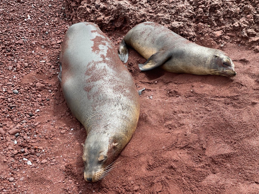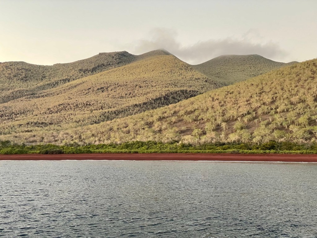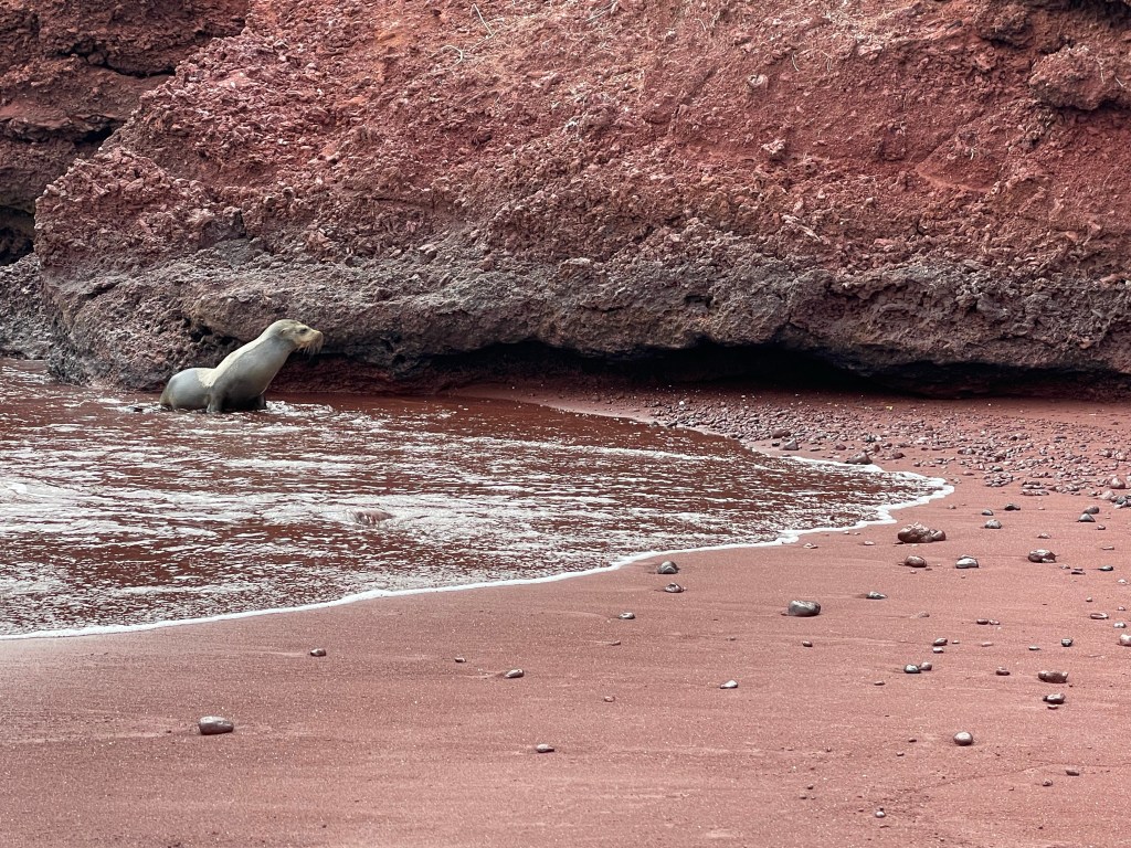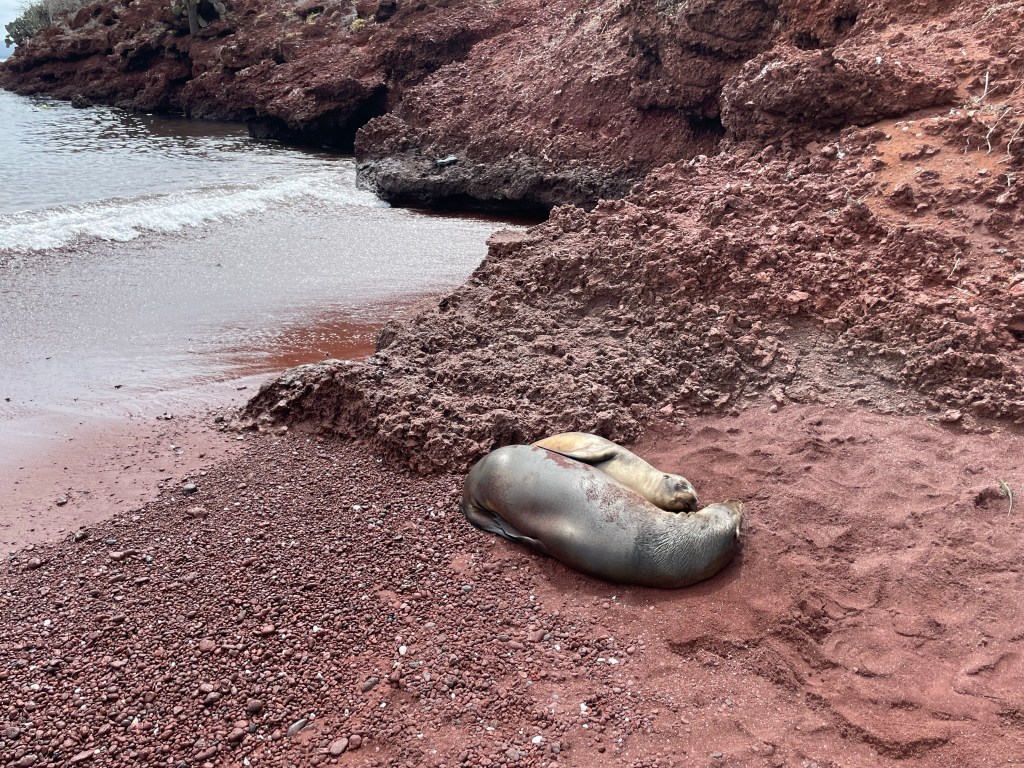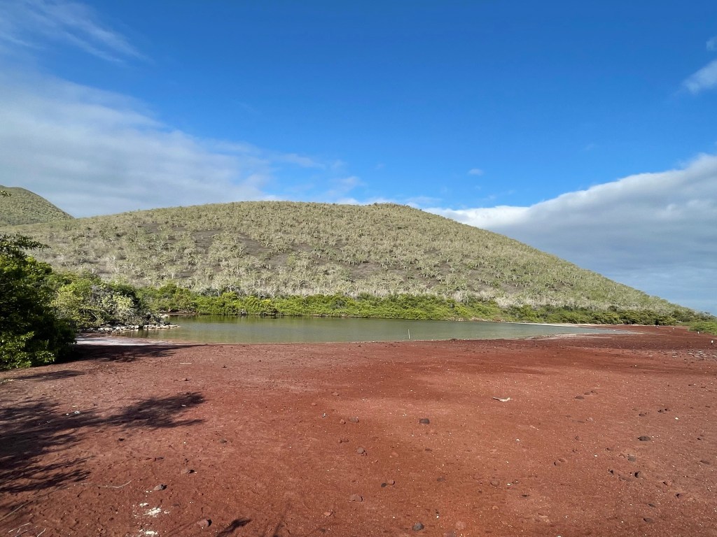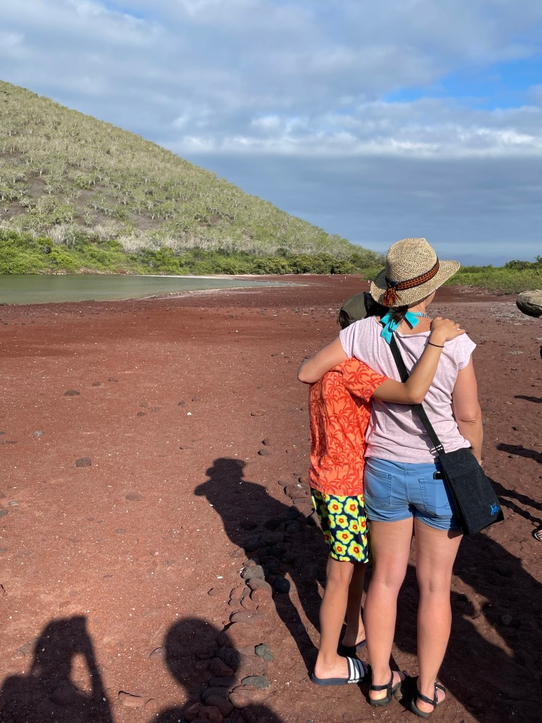 Wet landing on Rabida was a mini shit show for Kyra; losing her sandal (don’t worry, it floated back) and struggling to get her stuff together. The rich color of the beach was so enchanting. Andreas led us around a wall of vegetation to a large brackish (combined salt and fresh water) wetland area. Normally this is the type of environment in which flamingos would thrive but since baby sea lions are like impudent toddlers the conditions in this particular lagoon don’t remain flamingo-friendly. Mosquitoes buzzed all around as we stood around and listed to Andreas explain the ecosystem on this island and more fun facts; such as that flamingoes are born with straight beaks that curve as they mature. They are also born white so I’m guessing the first one I saw on Isabela was a juvenile. I can’t remember what all of her multiple frustrations had been but the mosquitoes were getting the best of her and Kyra declared, “I am not happy right now.” How could you not be happy right now?! We were in the Galápagos, we were on Rabida Island! This is a once in a lifetime experience; no pettiness should be enough to distract from soaking this in. I had to take a few steps away and remove myself from that energy until she settled (sorry, Kyra!). In contrast, I captured a sweet candid moment of young Camilo and his mother, Andrea, sharing a quiet side hug as they listened.