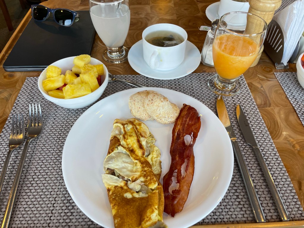 Enjoying the quiet stillness of the early morning I sat at the bar in the lounge to write before the day’s activities began. Greg sat on the other side editing through photos he had shot the day before, sharing a few of the extraordinary images he had been able to capture with his oh-so-complicated Canon and telling me how he’ll slowly share them on his Instagram page after the trip. We occasionally shared thoughts and photos while respecting each other’s obvious desire for quiet concentration. I like my morning quiet time. The shining start of breakfast this morning was a sweet yucca bred that was a perfect compliment to my omelette, fruit, and sweet tomato juice.