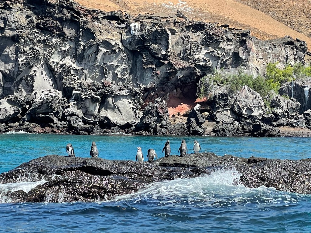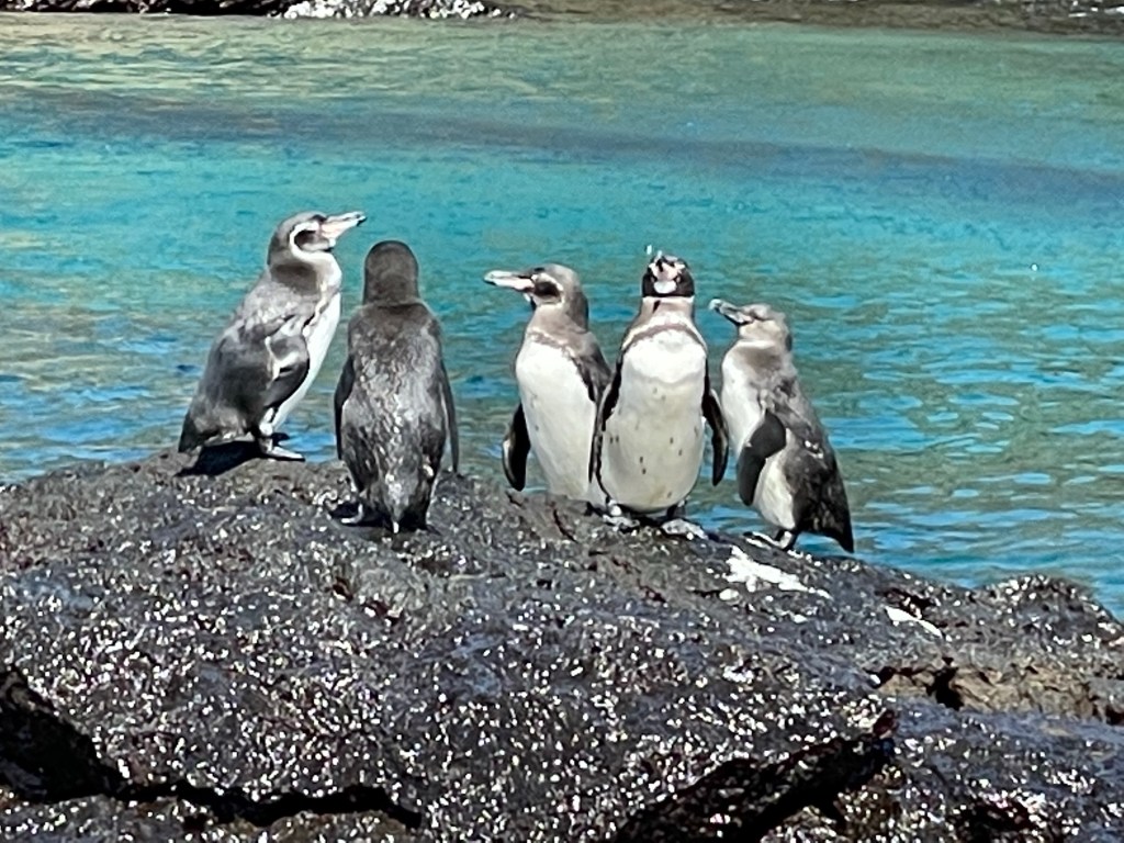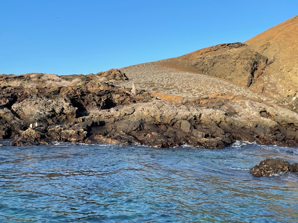 Bartolome is another island I have been especially eager to visit given its inconic volcanic lookout point. I hadn’t even realized that it also had penguins!!! As the panga neared the beach for our wet landing, adorable little Galápagos penguins were spotted hopping around a lava rock jutting out of the water. I had been excited to see two penguins on the Tintoreas excursion on Isabela and here I was, seeing a whole flock that I hadn’t even expected! Andreas directed the panga driver to divert from the beach to the outcropping so we could get a closer look. Penguins hopped around, preened their feathers, looked at us curiously, and basked in the sun. I don’t know how I’m going to manage to smuggle both a penguin and a baby sea lion home! I was so rapt by the tuxedoed cuties that it took me a moment to realize the crystal clarity of the deep water against Bartolome.