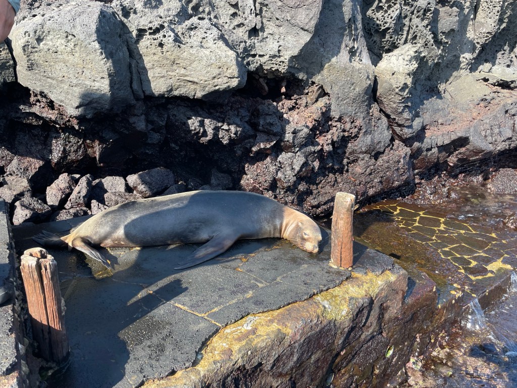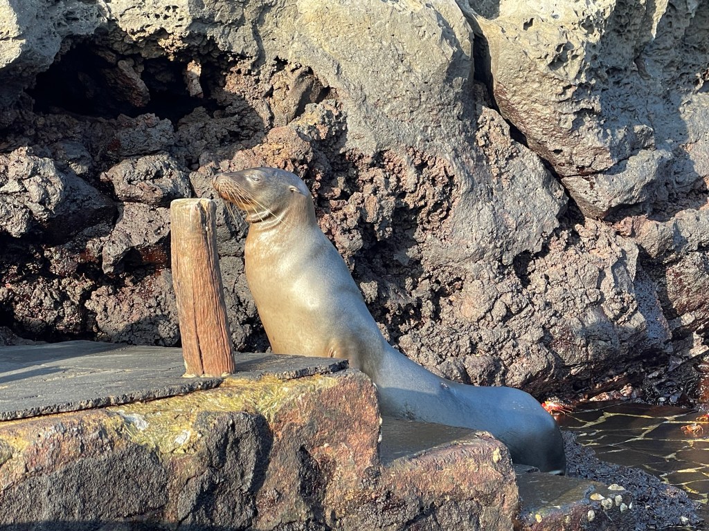 On the way back down, Bruce, Jouhayna, and I hung back; taking our time to soak up our surroundings and chat. We talked about hockey teams, the absurdness of professional sports salaries, and California politics. Turns out, Bruce was a California guy; having grown up in Carmel. Finally getting back to our panga, our sea lion friend was still taking up residence on the steps but this time she had turned around and we could see a circular round wound on her side; poor girl.