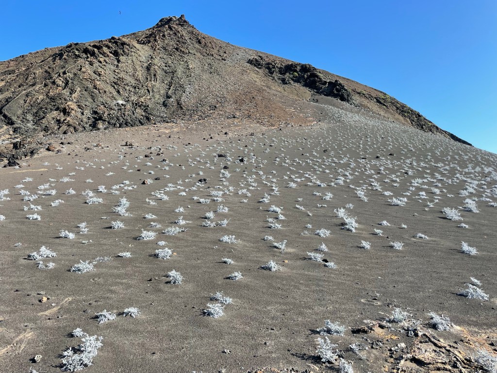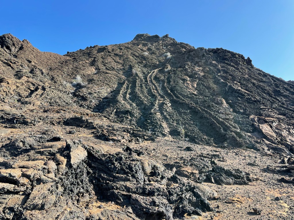 This time the pangas went left of the beach and dropped us at the base of some steps. A sea lion had claimed the first few so I was grateful my long legs could reach the third step with ease as we disembarked. As a very young island, only about one million years old, Bartolome doesn’t have much life on it yet. Small pioneer plants, that sounded like they were called tequila Galápagos but are actually tiquilia nesiotica dotted the side of the cinder cone. Beyond the pioneer plants lava flow streams clearly ran down the side the cone.