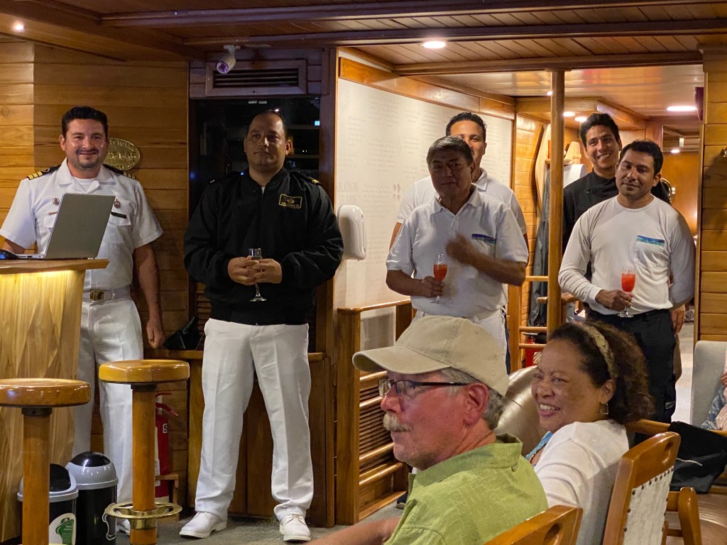 Upon boarding the yacht the crew had been too busy for a welcome cocktail so instead they arranged a welcome/farewell cocktail for tonight. Seven of the ten member crew came to be introduced and toast with us. The other three were too busy working since someone had to keep this boat moving in the right direction! Captain Manuel and the crew were dressed in proper uniform. I was amused as they’d spent the rest of the time in shorts and t-shirts so this was the first time we’d seen them dressed in their best. Billy made opening comments and introduced the crew before turning it over to Captain Manuel to address the room. He then took back the mic to lead us through an animated toast.