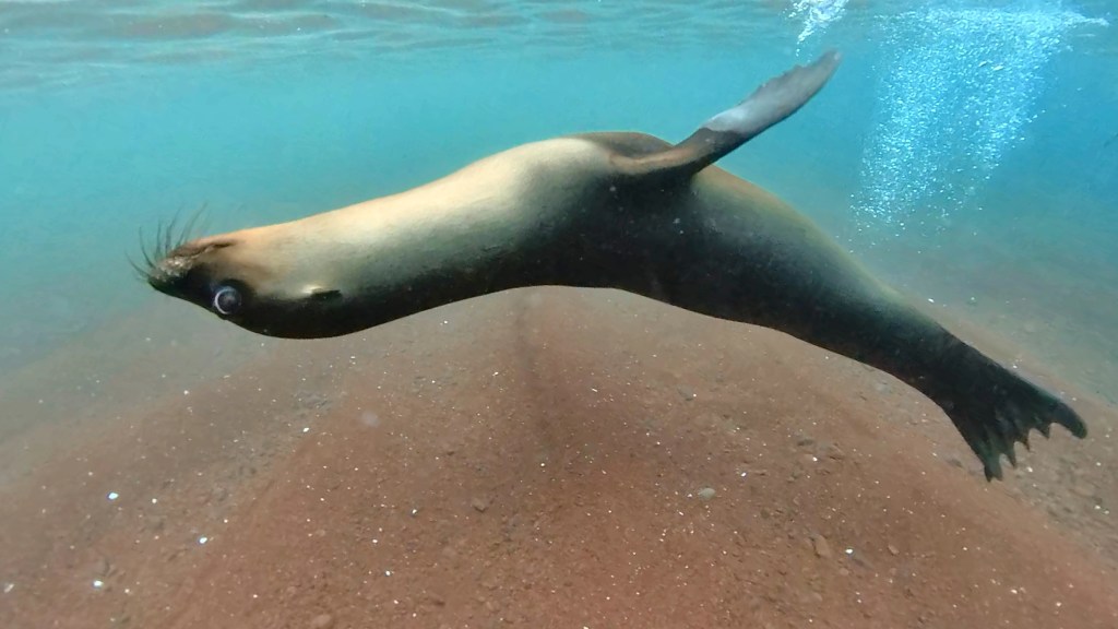 Huge puffer fish glared at me as I swam back towards the beach; I didn’t know puffer fish could get so big but these guys were monsters! Something brown darted past, startling me. I hadn’t even seen sea lions on Bartolome yet and now here they were spinning and playing beside me. What a great snorkel outing; definitely the best of the trip, and this is the last snorkel of the trip; definitely a grand finale. White tip reef sharks, assorted giant schools of colorful and not-so-colorful fish, puffer fishing, diving penguins, playful sea lions and so many colorful and intriguing random fish. I didn’t get to see any marine iguanas or turtles during my snorkels but the diving booby and penguin pal were quite a bonus to make up for it. I mean, I got to snorkel with a penguin, shark, and sea lions all on the same outing. How cool is that?