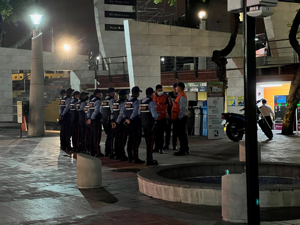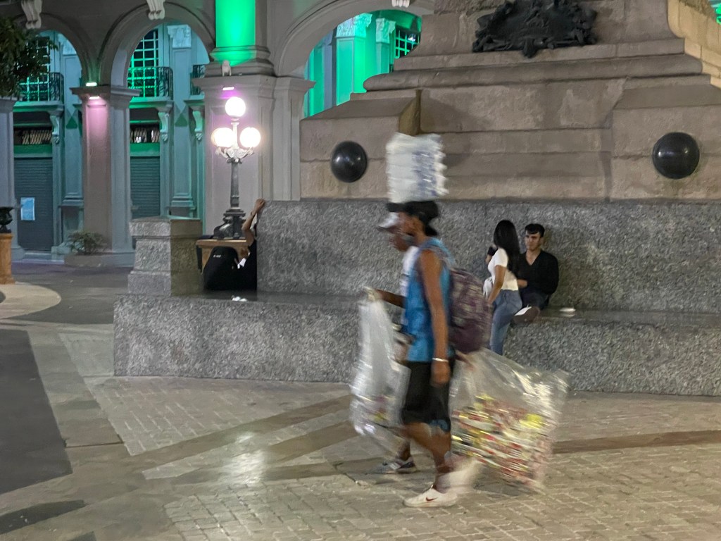 Lines of police officers stood at attention getting their marching orders for the night. Like I’d previously observed, there continued to be a heavy police presence in this town. As we turned onto a side street into downtown, young men walked by with cases of water balanced on their heads, presumably ready to go sale them on the Malecon.