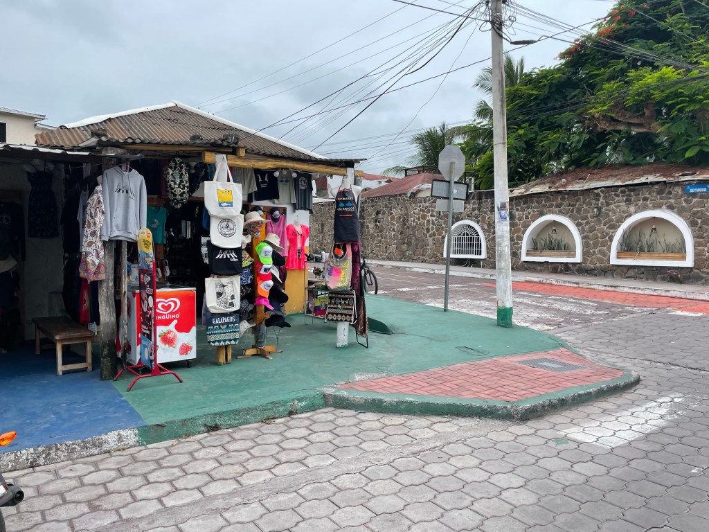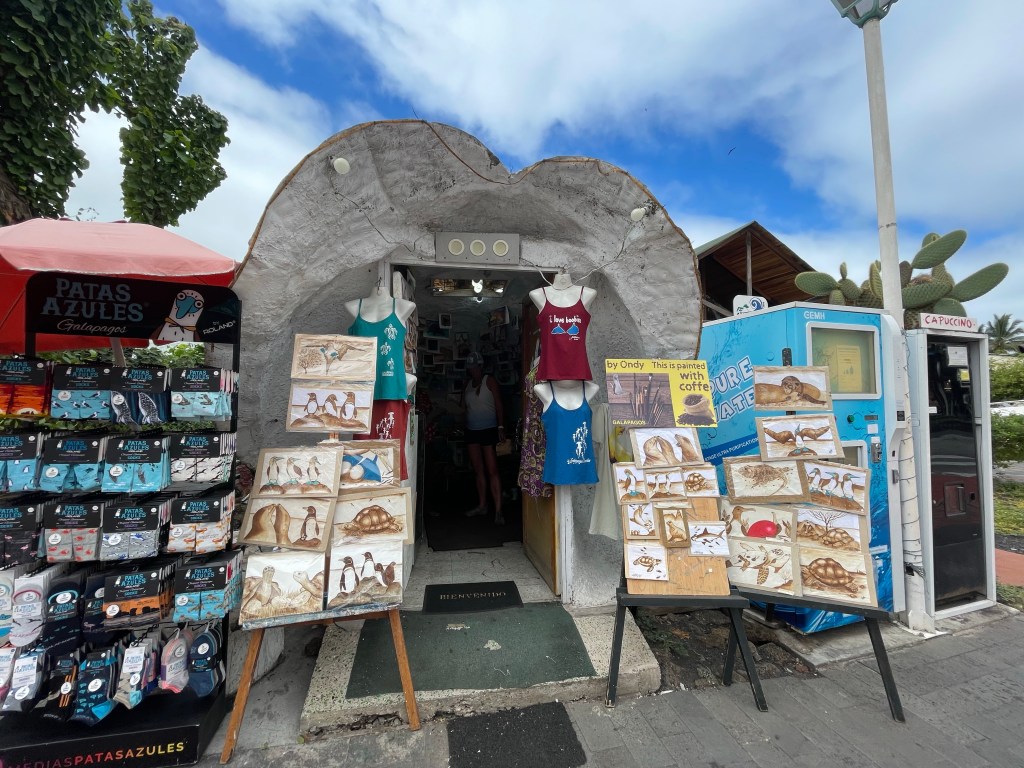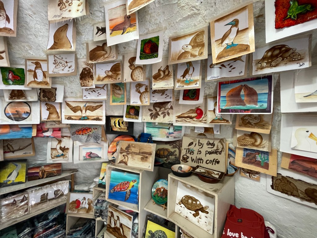 We probably spent a little more time than we should have at breakfast and only had about half an hour left before we had to be back at the AirBnB to meet our taxi. It was just after 10am and the already sleepy streets of Puerto Ayora were almost completely still. I bought a couple little mugs at an artisan ceramics shop before making our final stop at a tiny little bunker of a structure that smelled like coffee and was lined with mostly brown paintings.