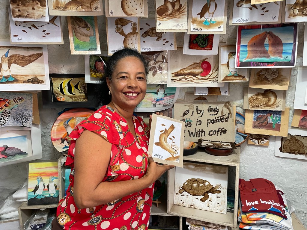 The artist/shopkeeper, Ondy, invited us in. All the artwork was hand painted by Ondy using coffee as her paint! She had been sitting on the floor working on a piece when we walked up. She was so sweet and so talented. I quickly picked out a small swimming sea lion painting (time was of the essence so everything had to be quick at this point!) and she was happy to pose holding it before I paid her and waved goodbye. I LOVE all the local art here!
