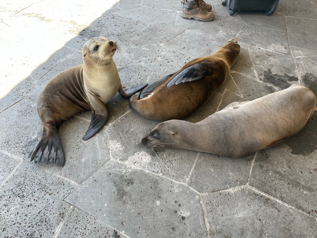 Trucks lined the road leading to the little dock, it was much more bustling than the other three times I’ve been here on this trip. Three sea lions lounged like speed bumps right in the middle of the fray; I almost tripped right over them trying to get to the boat ramp. One cute little baby lazily picked his head up to give me a wink goodbye before flopping back down. Our luggage was again sketchily loaded on top of the little ferry before our quick trip across the stunning channel. The water in the narrow channel is a special shade of blue; so clear and marbled with so many shades of turquoise, pale blues, darker blues, hints of green. From the sky it resembles a unique jewel with the soft white sandy bottom and volcanic rocks creating shallows.