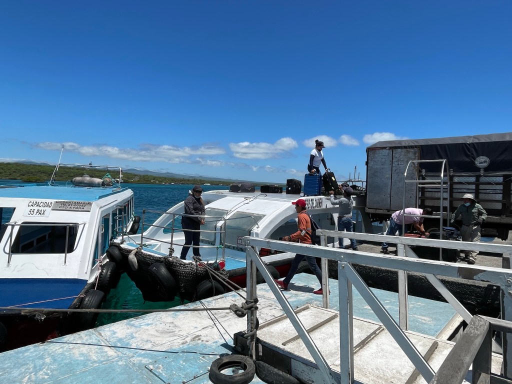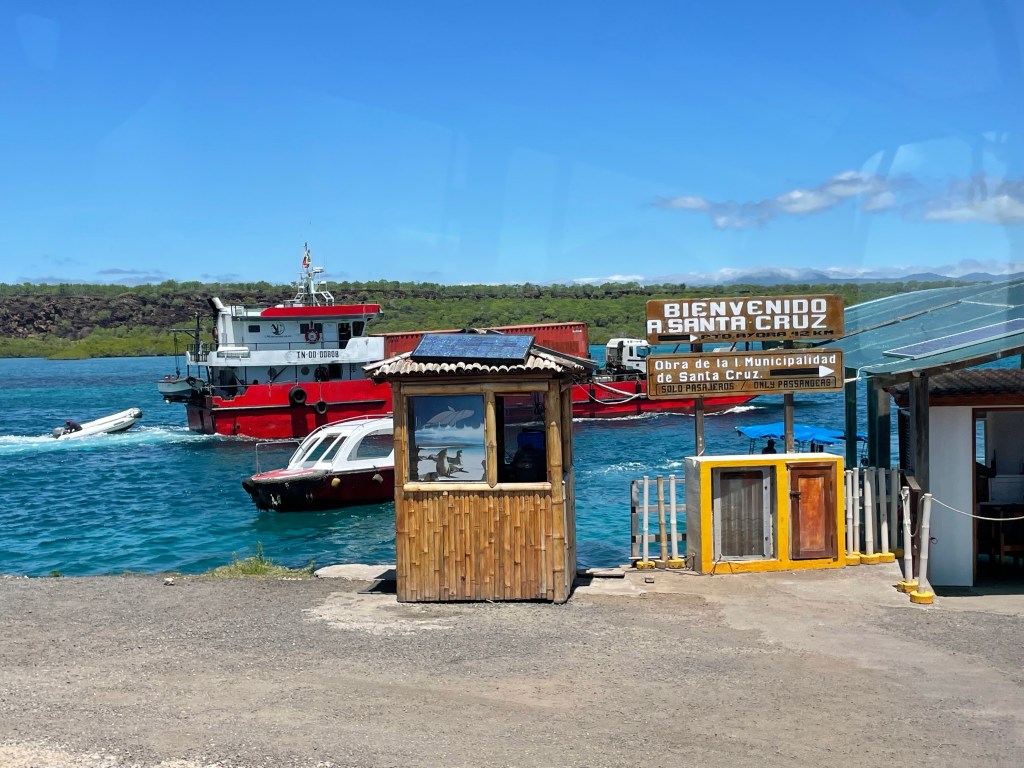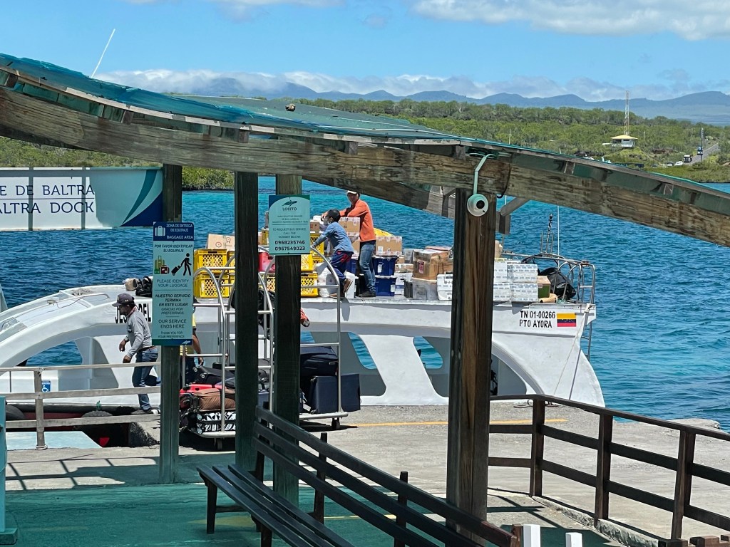 It was a bittersweet ride across the channel knowing that this was really the end of my trip to the Galápagos. On the dock in Baltra, my hunch was confirmed, it is indeed provisioning day for the islands. Crates of provisions were being loaded onto ferries, presumably having just arrived by air, to be taken across to Santa Cruz and the long line of trucks waiting to be loaded down with supplies. A boat carrying a container truck floated by.