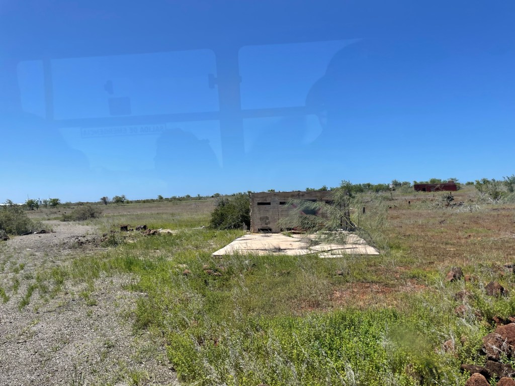 After a few minutes, the airport bus arrived to take us from the dock to the airport. As with the Baltra/Santa Cruz Ferry, it was my fourth time on this bus now. This time I searched the landscape for signs of the old air force base, finally paying closer attention to the abandoned buildings and concrete pads where structures once stood.