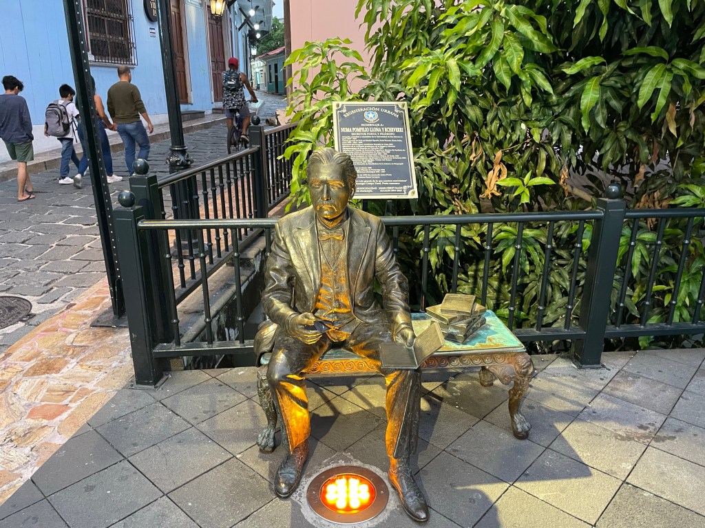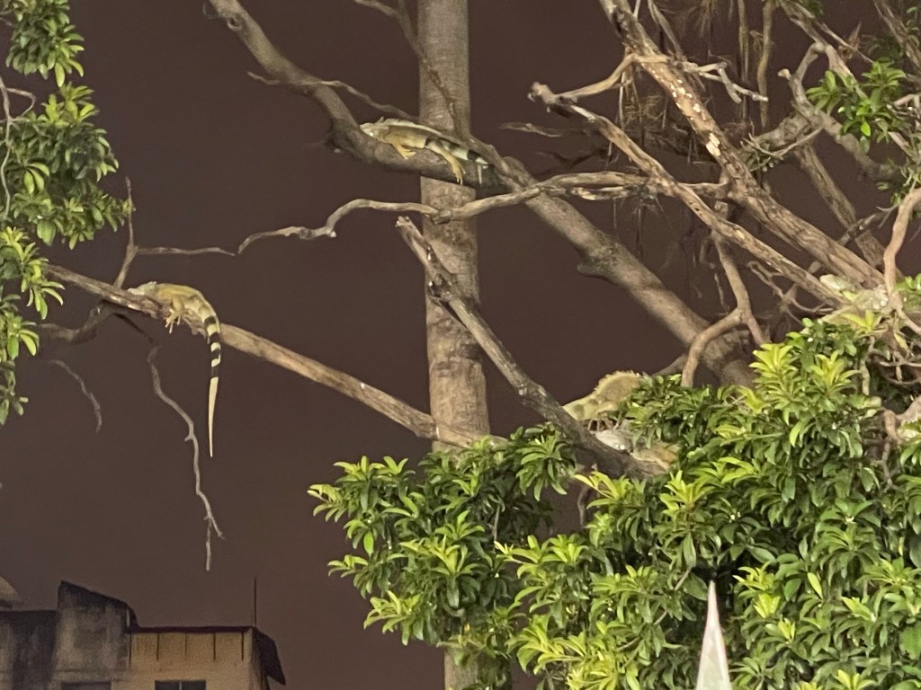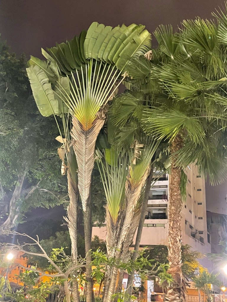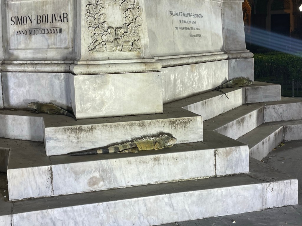 Arriving at Parque Seminario I pointed out the iguanas resting on monuments and hanging out overhead in trees; warning Paul and Kyra NOT to walk under any lest they get crapped on. These would be my last iguanas of the trip. I studied how different they are from those on the islands and also noticed a weird palm tree with its fronds fanned out to the side; a tree I had not noticed last time. The park was so still in the evening light compared to the vibrant bustling it had been a little over a week ago.