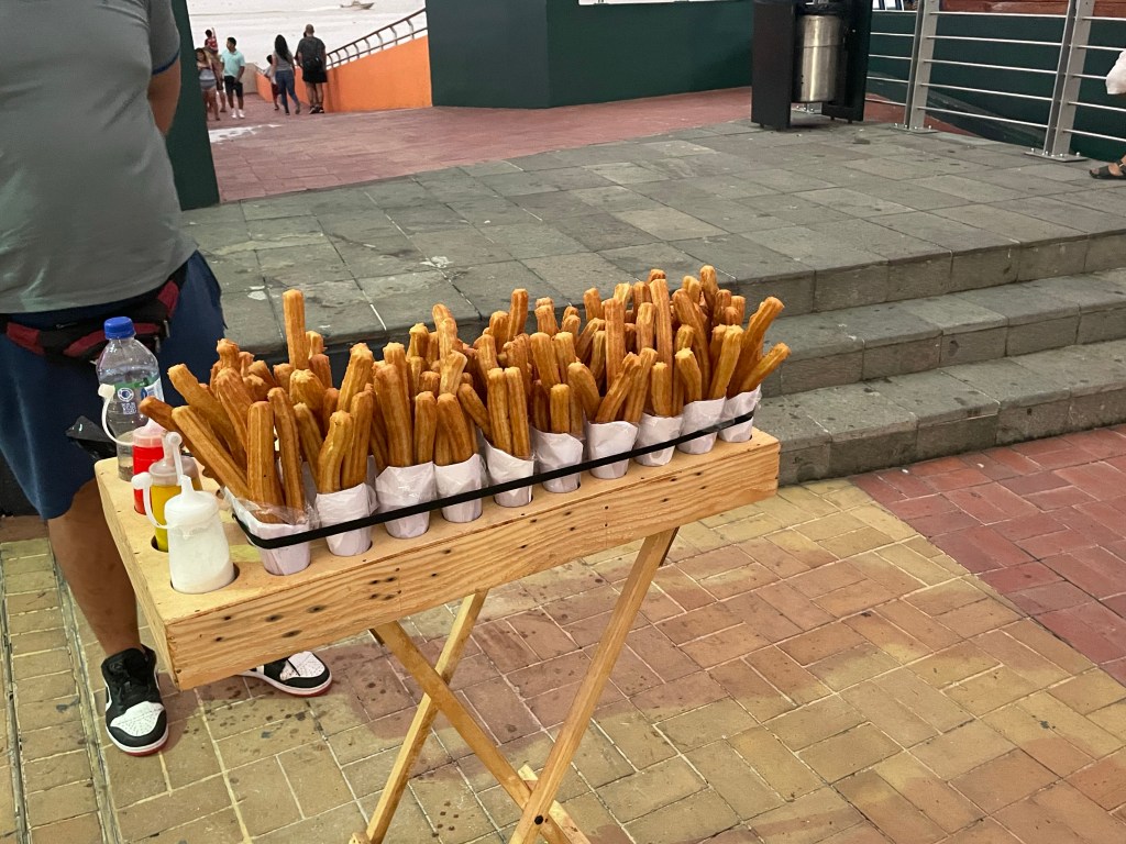 Walking the opposite direction of my previous visit and in the dusky evening it felt very different. I noticed new artwork that I’d been oblivious to before; a vibrant painting of a masked nurse under the AeroVia. La Perla lit us the sky grew darker. Every 100 yards young men were selling cups of churros. CHURROS! I had to use my self control to stop myself. I needed real food first and how fresh could those churros really be?