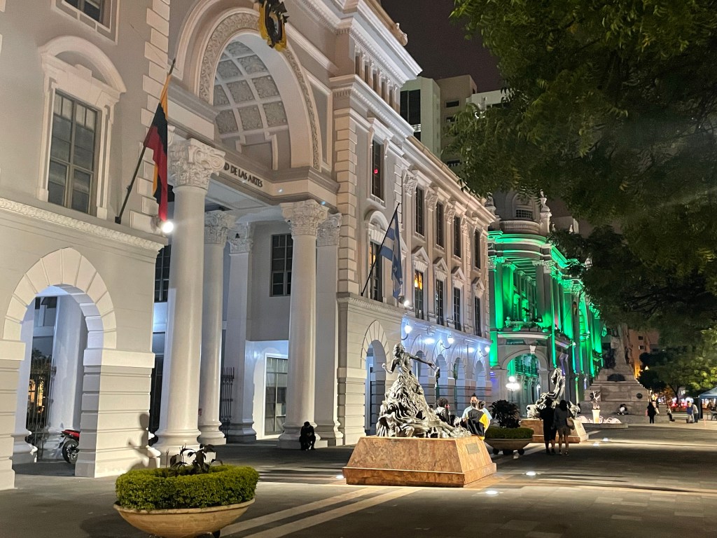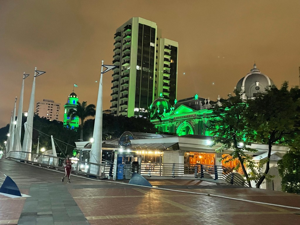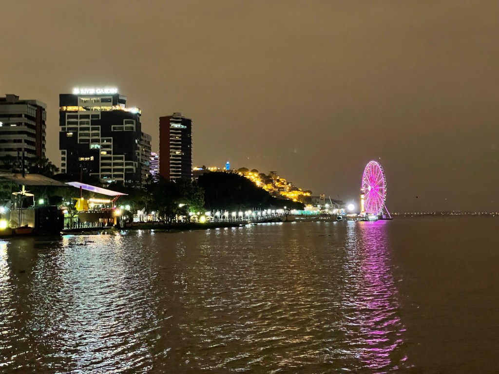 The apartment is just a block or so from where I stayed my first night in Guayaquil so I had some comfort in knowing my surroundings. It was nearing early evening so I suggested that we walk the Malecon toward downtown, stop by the iguana park, and then have dinner at La Pata Gorda, where I’d eaten my first night. On the way back we’d hit up the giant La Perla ferris wheel. This plan was approved and I led the way, past my first night’s AirBnB, pointing out the steps that Paul and Kyra should take tomorrow, and to the Malecon.