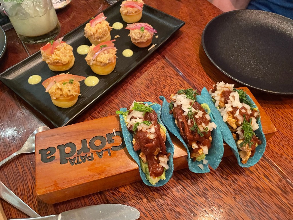 We began our feast with amorfinos del centro, the mini cassava souffles with crab, my favorite from last time, los irreverentes de urdesa, pork rind tacos, and tesoros del mar, mixed shellfish and octopus in garlic cream. We tried to order crab claws but they weren’t available. Communication was a challenge but I think you could only get claws by ordering a whole crab tonight? It was unclear. The amorfinos were as delicious as I remembered them and I wanted more. The bits of shell accidentally mixed into the crab were a crunchy reminder of how freshly made the delightful little diddies are. The tacos were a feast for the eyes in a bright blue shell but one bite was enough for me to confirm that they weren’t worth the calories. I’m not exactly a pork rind type of girl.