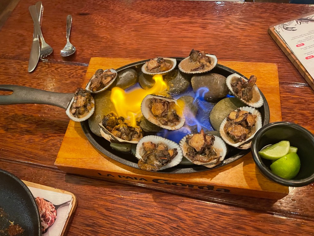 With flaming fanfare, the tesoros del mar were presented. Literally, the skillet was throwing off flames. A finger or two may have been burned trying to grasp at a shell. They were good but not as spectacular as their presentation. I’m not a heavy cream type of girl either.
