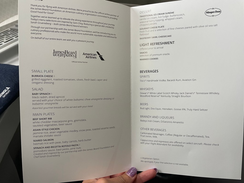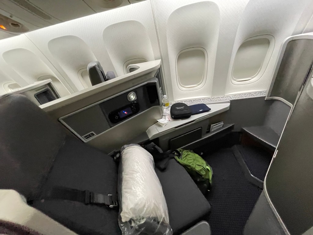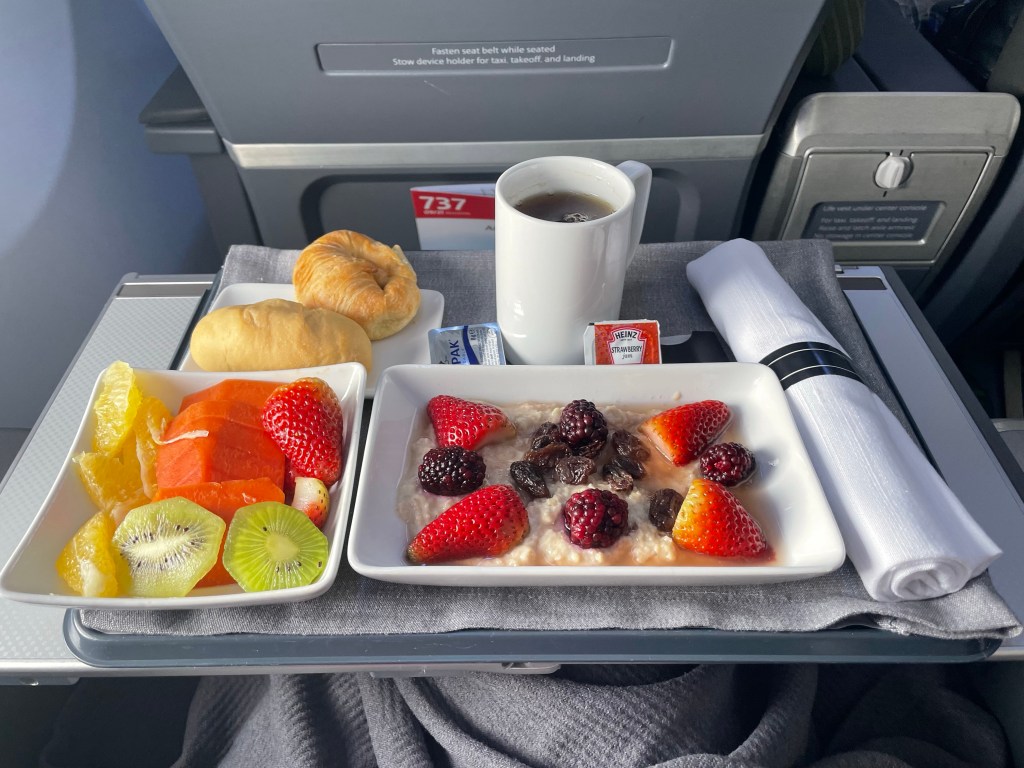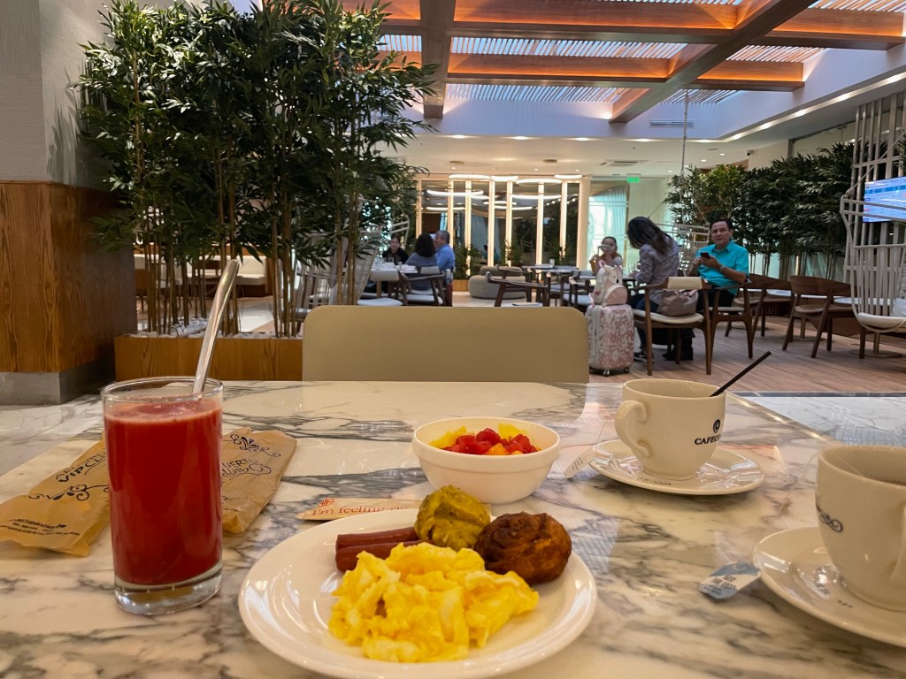 American Airlines has a comprehensive app-based check-in process, complete with COVID test review so the airport was relatively quick and efficient, even though they only had two kiosks open at passport control/security. I checked my bag, because who cares if it gets lost coming home, and since now I had a second carry on bag of delicate sculptures and the like to worry about carrying on. Conveniently, the airport lounge was located right next to my boarding gate. The lounge was large, modern, and bright with a decent selection for breakfast. I made a flightfud and some tea, and thought maybe getting some food in me would help my increasingly yucky tummy. It didn’t help; I ate a couple bites and knew it was a lost cause as I started to consume a concoction of both herbal and typical OTC drugs.