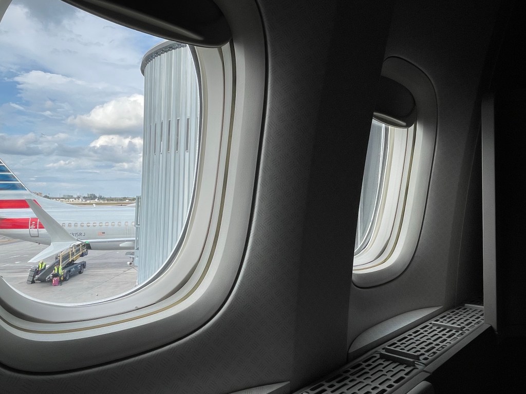 I could barely hear or understand as they started to board my flight but I knew that with my business class ticket I was in the first boarding group so as soon as I saw non-pre-boarders begin to board I simply followed suit. As soon as the cabin doors closed an announcement was made and the masks all came off; even the crew. With current mask requirements whether or not you have to wear one depends on the destination and sooooooo thankfully the US had lifted the mask requirements so my face was free. I had an empty seat next to me for the 3 1/2 hour flight to Miami and I slid over to watch take-off and get to enjoy the window. I really love a window seat but am just too claustrophobic so sit in one if there is anyone next to me.