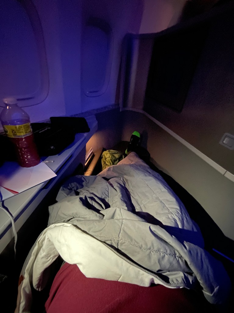Like a giant beast struggling to take flight, the huge jet finally got off the ground. I was so tired; I only slept about five hours last night. I barely kept my eyes open while the plane climbed and as soon as I heard the familiar ding of surpassing 10,000 ft, I laid my seat flat, curling up under my blanket. I slept for at least a solid two hours. And not just a light nap, but a solid, deep sleep; complete with a detailed dream and maybe even some drooling. I love a lay flat seat; having one on this flight made me so happy. This flight could have really sucked without it.