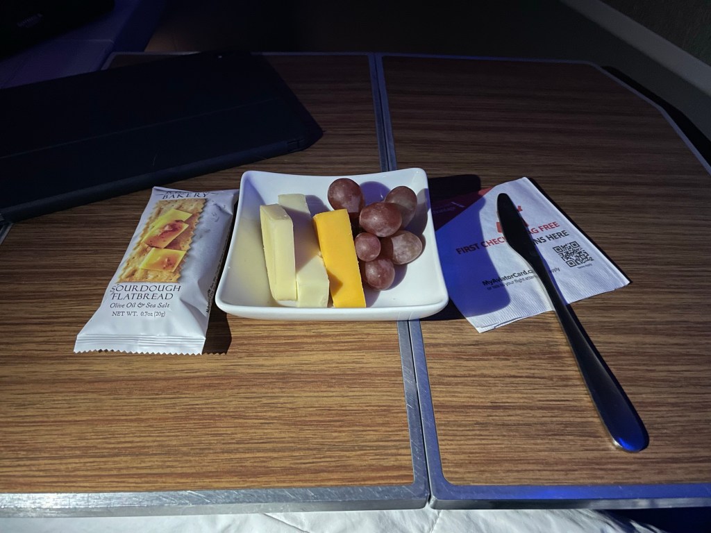 My stomach was so upset when I woke up, bubbling and churning. You know that saying, “Never trust a fart?” I started to wonder if I was approaching that point. It was time for the heavy hitter; the azithromycin. I always get a prescription for azithromycin when I travel, specifically for stomach issues. I had slept through meal service and seeing that I was awake the flight attendant came to ask if I was ready for my salmon. Salmon sounded like it would run right through me at this point so I politely declined. I wanted to eat but I was scared to. Even though this jet had a refreshing large bathroom, I didn’t want to spend the rest of the flight in there. After sitting upright for a while and letting the azithromycin and more herbal meds settle into my stomach I finally asked for a cheese plate. I tentatively ate the gouda, swiss, and cheddar cheeses but the highlight for my tummy was the sourdough crackers. Crackers were just what I needed and they felt so good in my stomach. I thought about asking for more crackers but didn’t want to push my tummy too far.