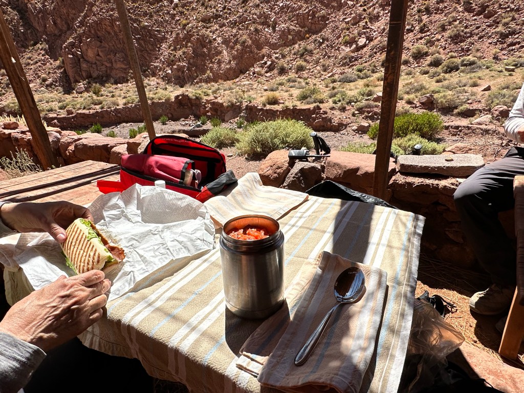 At least I am sleeping well given the early mornings. The breakfast buffet was the same today, and I ate the same thing as yesterday, before making my way to the meeting point by 7:20am for my scheduled 7:30am departure for Peñaliri, a full day hike spanning 9.9 miles with a max altitude of 13,160’. I filled all three of my water bottles and loaded up on snacks. Since today is a full day excursion the lodge provided options for lunch to take with, I chose the “canister” of a quinoa tuna mixture. Adrian is my guide again today and Lynn is the only other guest joining me for the hike.