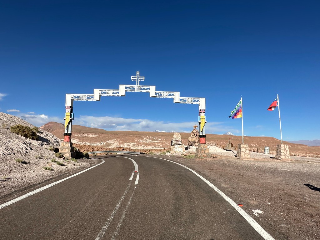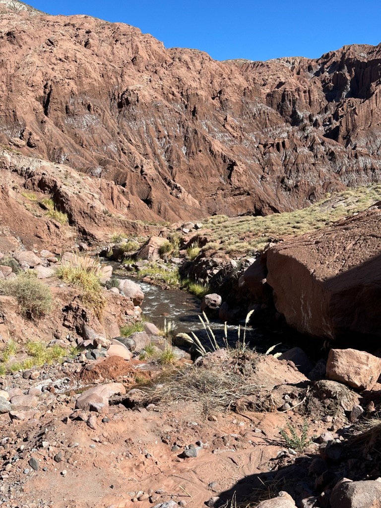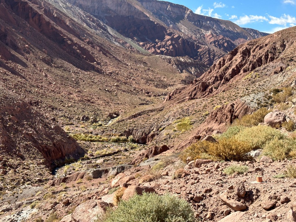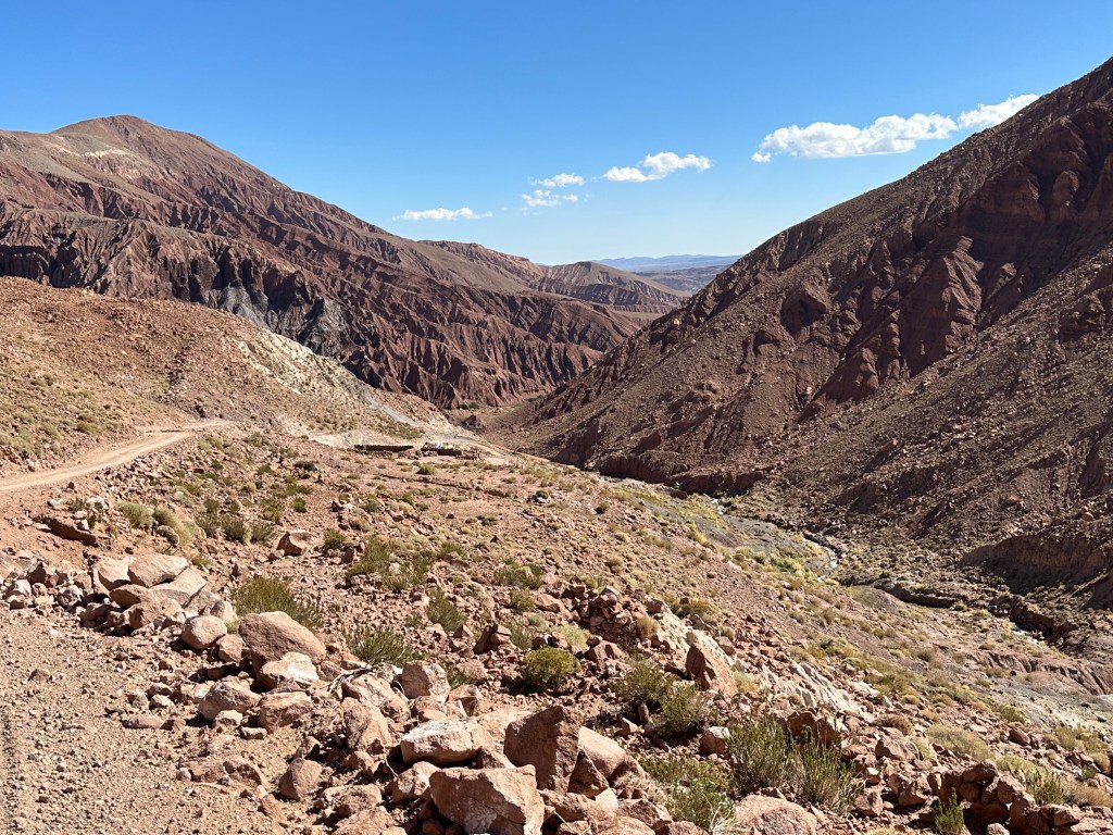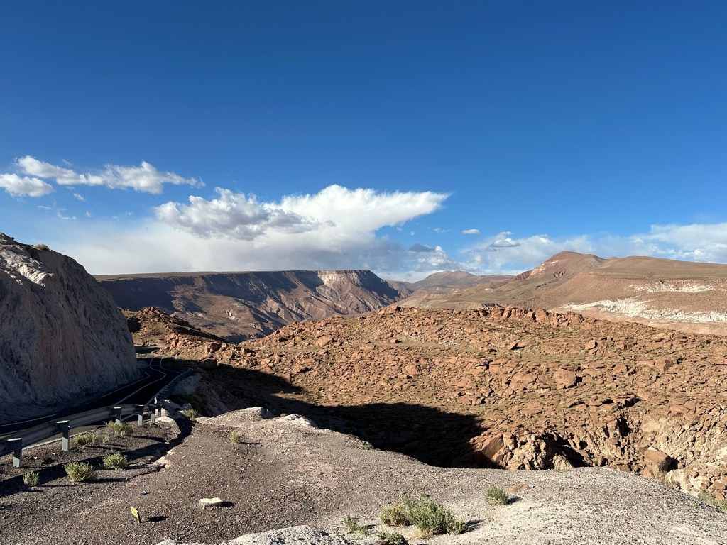 Rounding a corner, we came to a majestic intersection of the Domeyko, Salt, and Andes mountain ranges. It took my breath away to see the three layers of mountain ranges converging together, no picture can do it justice. It also distracted me from feeling yucky.