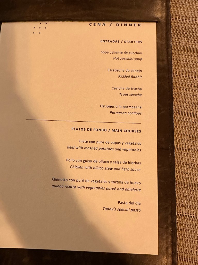 Back at the lodge around 6pm, I sat down with Adrian to review the rest of my week. I have figured out that when you are doing a schedule like mine with increases in altitude and hiking technicality each day your guide silently evaluates you at the end of each exploration to make sure that you are physically capable enough of continuing on with the explorations you have planned. I have another full day hike, though much shorter, planned for tomorrow and I am good for it so he reviewed the hike with me and had me choose my lunch. I was devastated to hear though that I wouldn’t actually be on a volcano. Apparently Volcan Blanco is a local nickname for an expansive rock covered with white sediment and no actual Volcan is involved. Poor Lynn though, it’s easy to lose track of time, and she was off an entire day. She sat down to review her next day only to find out that she’s actually leaving in the morning and this is her last night, not tomorrow night, oops! Lynn has been great company but she is a very intense, type A personality so I’m not necessarily sad to see her leaving though she is a wonderland lady.