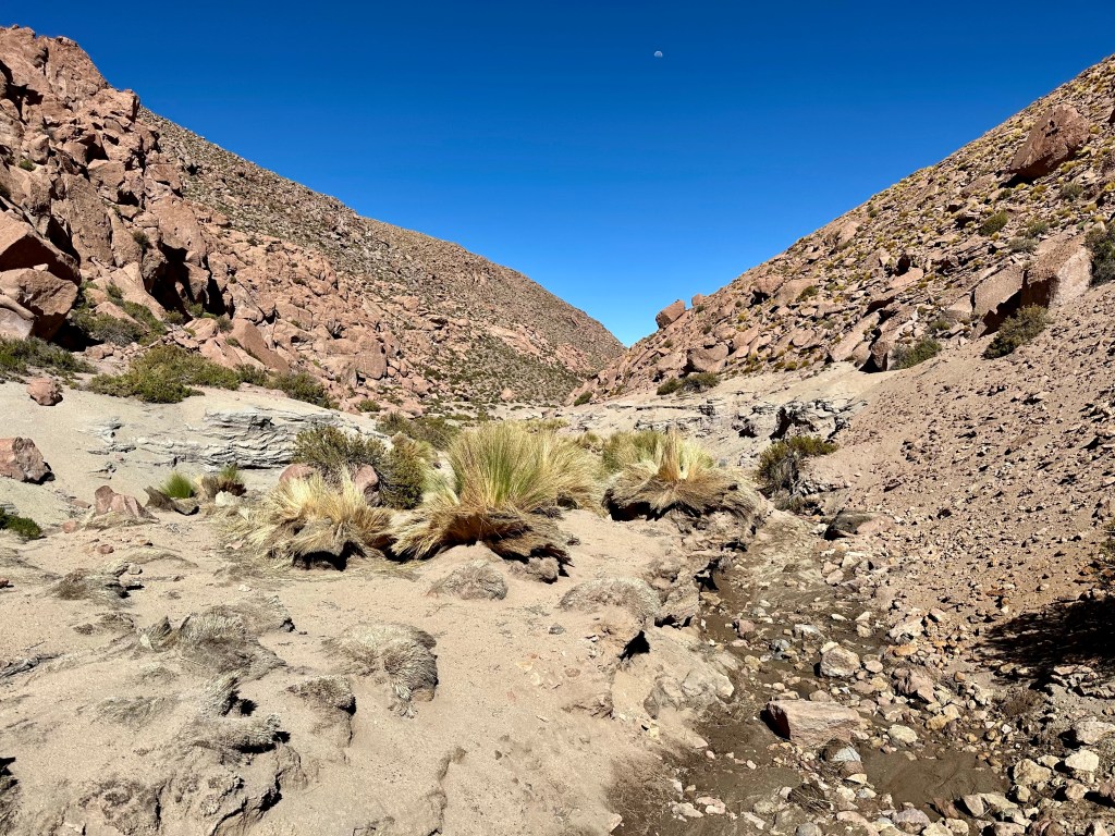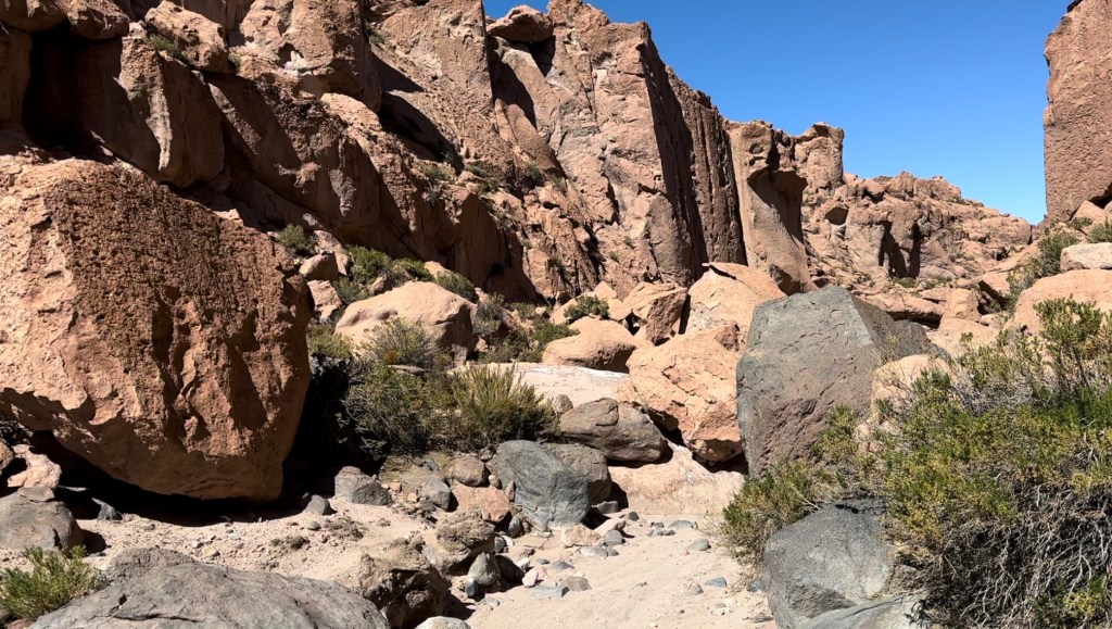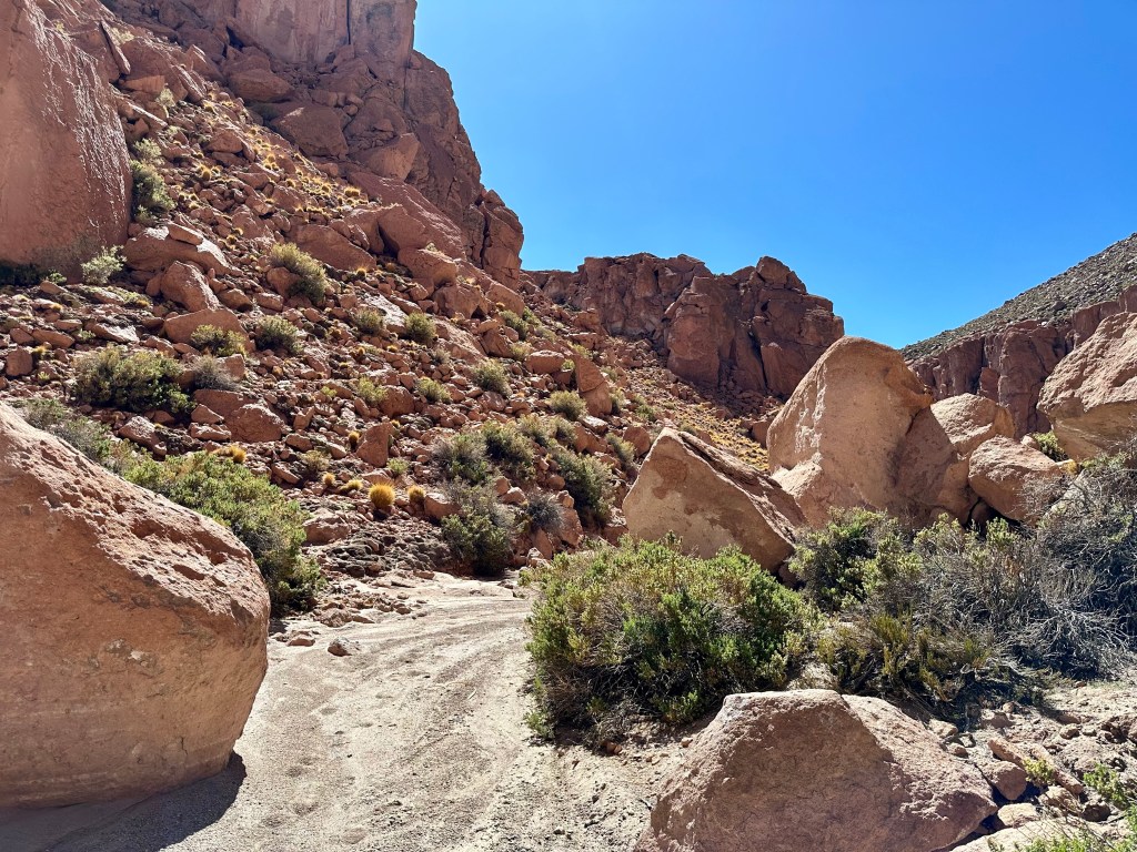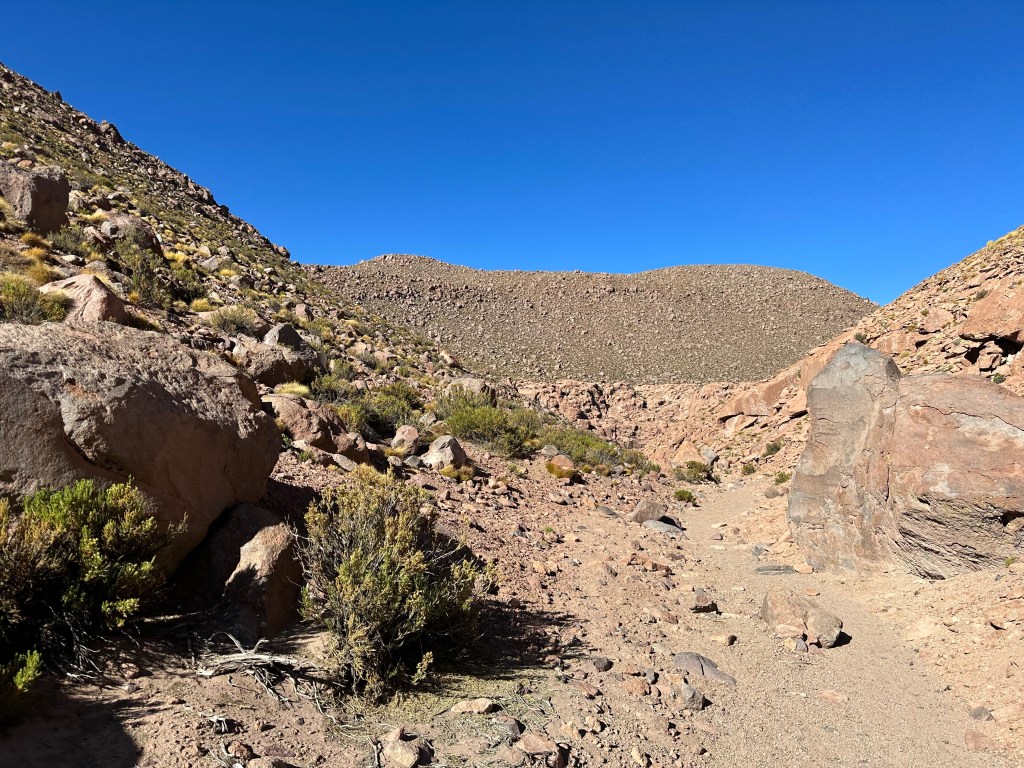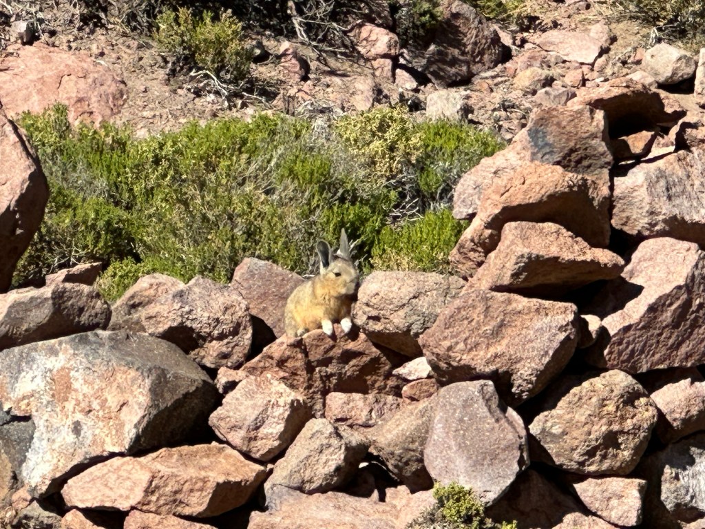 As with other hikes, Incahuasi starts with a nice easy trail. A young viscacha, aka bunny mouse since it looks and moves like a rabbit but is actually a rodent, perched adorably on a rock, watching us pass. The trail came to a dead end at a hill, which of course meant it was time to start climbing. Up one side and right down the other were now in a narrow valley with sparse plants and a sandy dry riverbed.