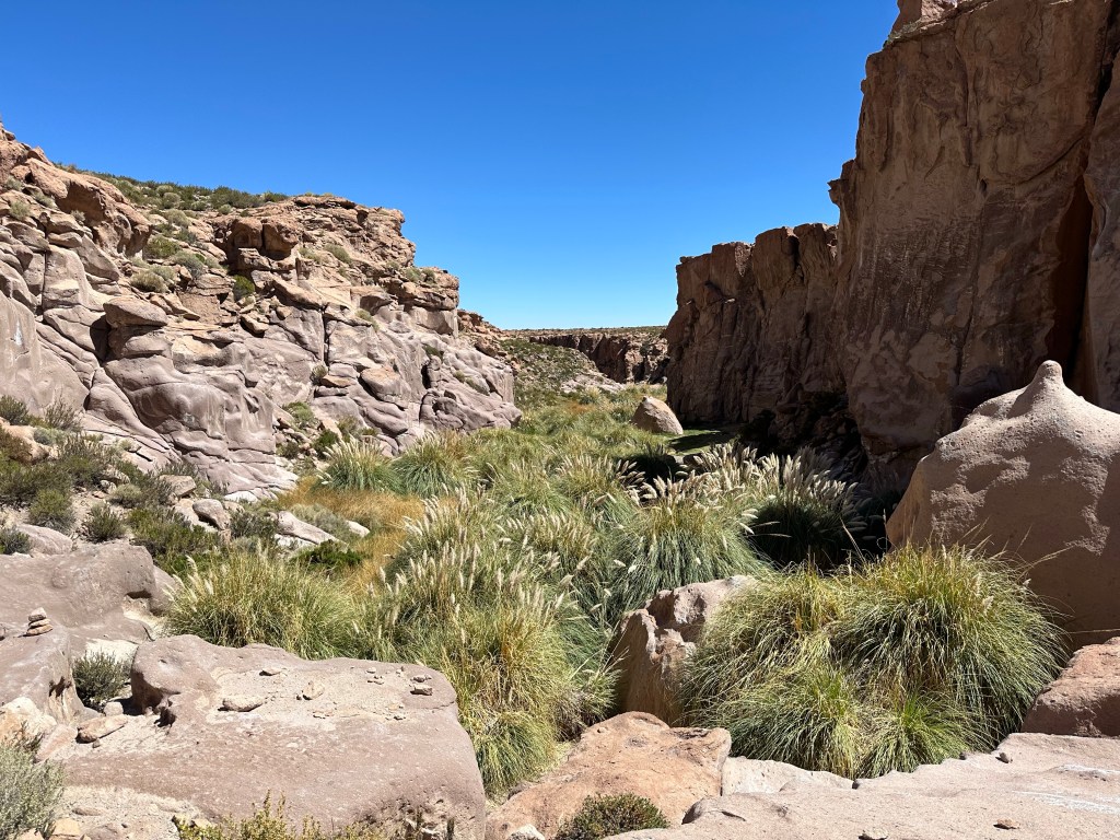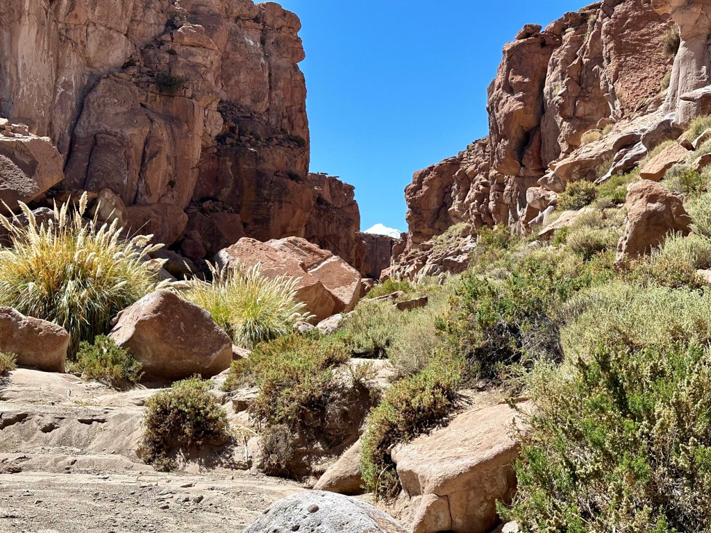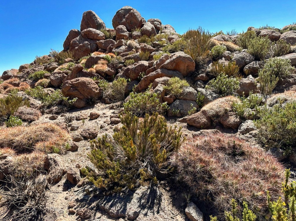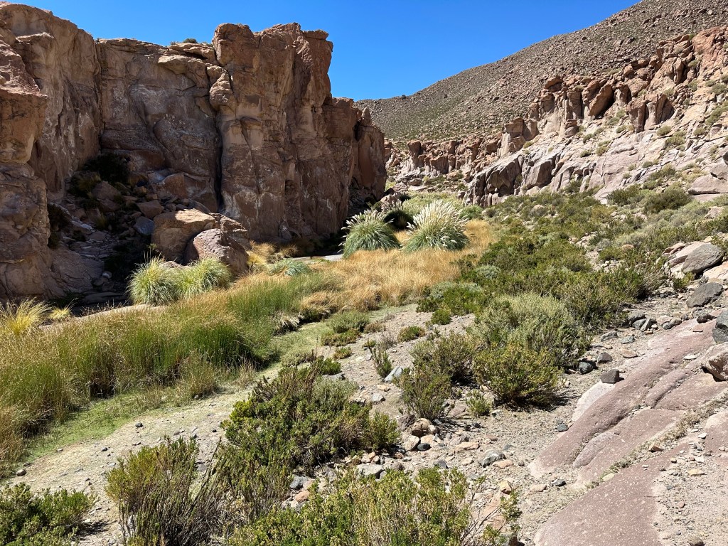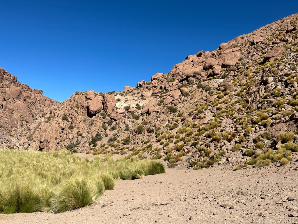 As with other hikes, Incahuasi starts with a nice easy trail. A young viscacha, aka bunny mouse since it looks and moves like a rabbit but is actually a rodent, perched adorably on a rock, watching us pass. The trail came to a dead end at a hill, which of course meant it was time to start climbing. Up one side and right down the other were now in a narrow valley with sparse plants and a sandy dry riverbed.
