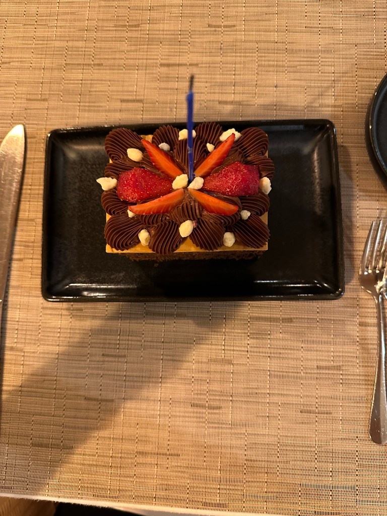 James was sitting alone when I got to the dining room and I joined him. It was nice to have some company and it would have just been weird to sit alone at an adjacent table. The dinner menu was less then spectacular, the same menu from three or four nights ago rotated in. I was satisfied with my green salad and mushroom soup but barely picked at my fish. I wasn’t that hungry and it wasn’t that appetizing. As I stood up to leave my waitress rushed over, “Are you done? Are you leaving? Please sit!”I told her that I was indeed done and leaving; she clasped her hands and asked me to please just wait. I sat back down and she ran away, returning quickly with a cake, complete with burning candle, and the rest of the staff to sing “Happy Birthday” and inform me that it was time to make a wish. The gesture was so thoughtful and made me feel special but I still feel so bad because there is SO MUCH CAKE and nothing for me to do with it. I didn’t event want dessert that late! I cut a small slice, took a few bites, and did the old ‘move it around the plate to make it look like you ate more than you did’ trick before asking the wait staff to please offer it to anyone else in dining room that might want some.
