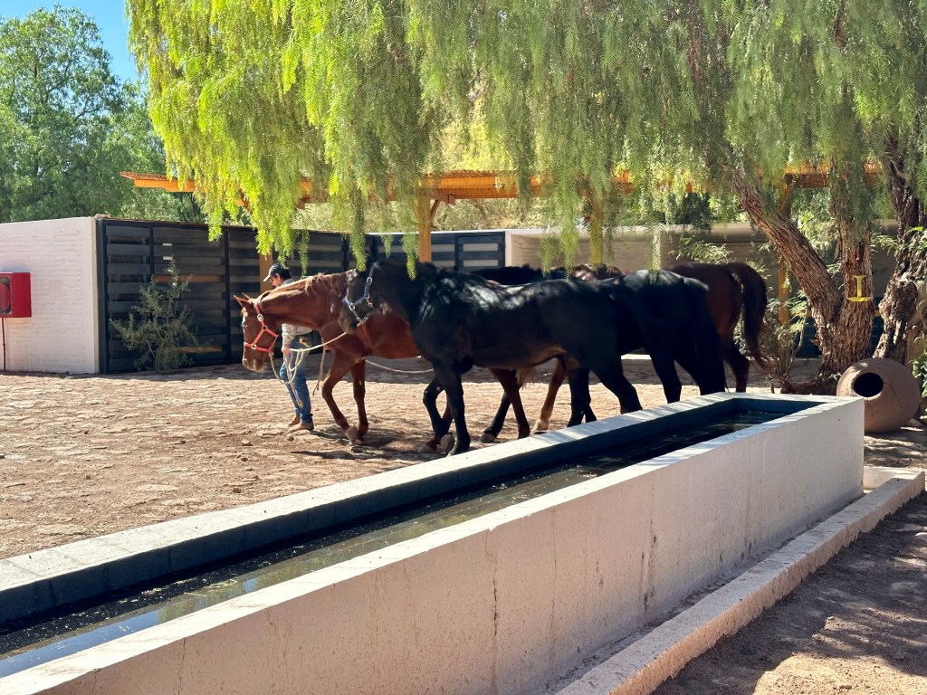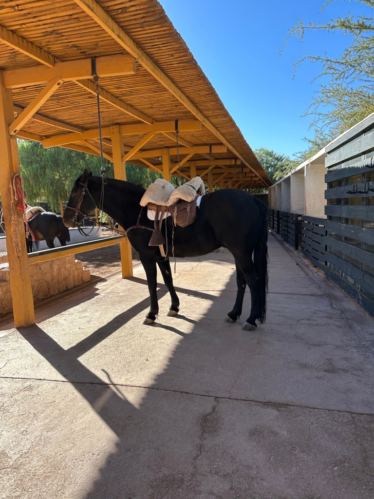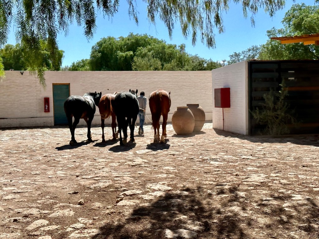 At my appointed time I was greeted in the lobby by Carolina, my guide for the horseback ride. She introduced me to Nicholas, one of the horsemen, and they led me down to the stable while Carolina explained the extensive equine history around Explora and how they’ve bred their unique breed of horses combing the best traits of the Chilean, Arabian, and some other type I can’t remember. Carolina fitted me with chaps and a helmet before introducing me to Edgardo, the lead horseman who helped me into the Chilean style saddle on Ooh La La, my trusty steed for the morning . The horses were all hardy, well fed, and seemed very happy. It always breaks my heart when I’m in other countries and see scrawny overworked horses being used for excursions, that was not the case here. I was surprised when Nicholas also geared up to go with us, for just me there was one guide and two horsemen for our casual ride to the salt mountain range.