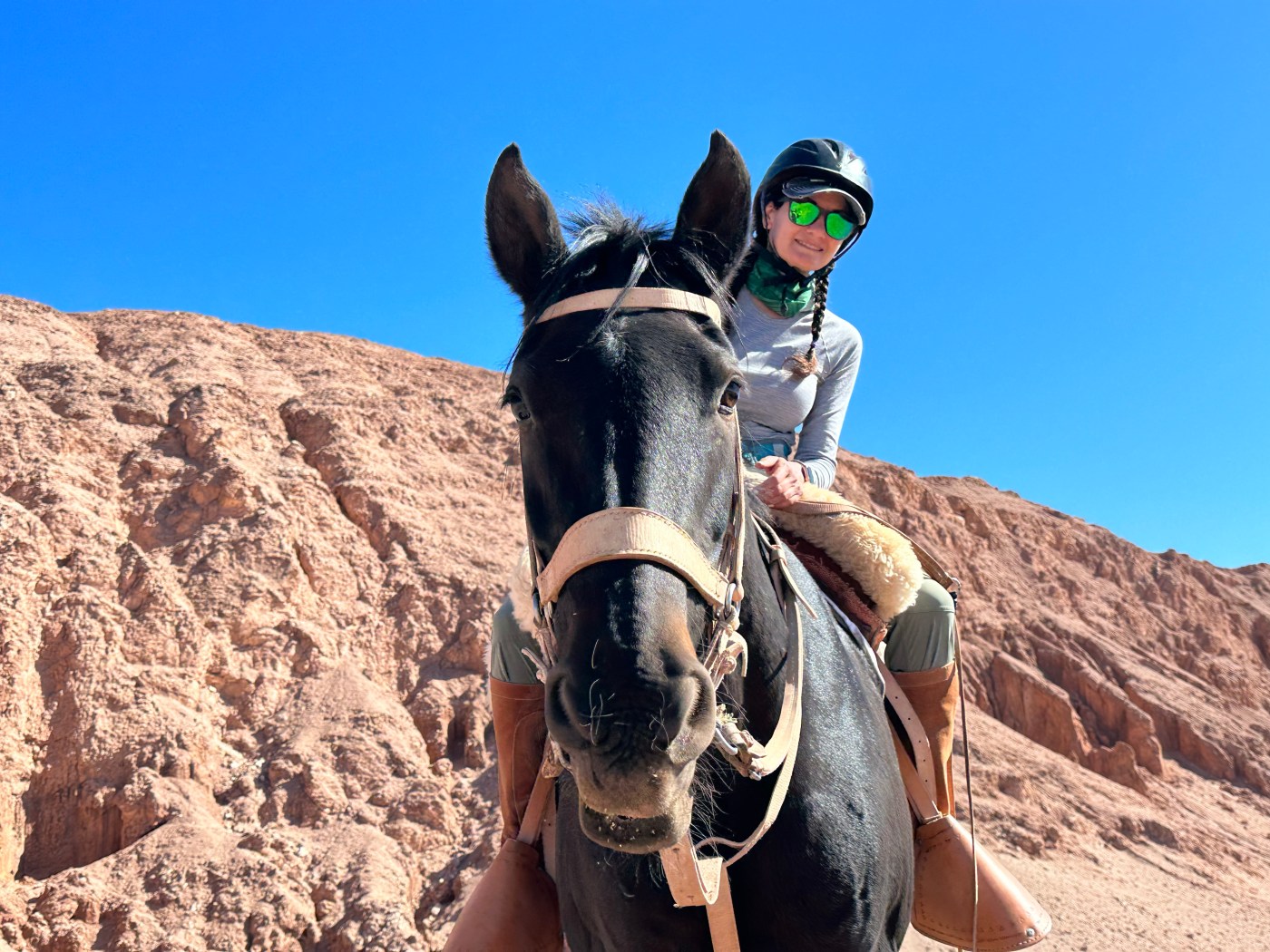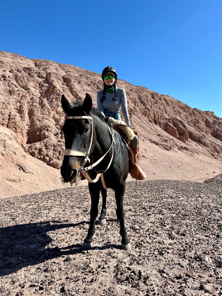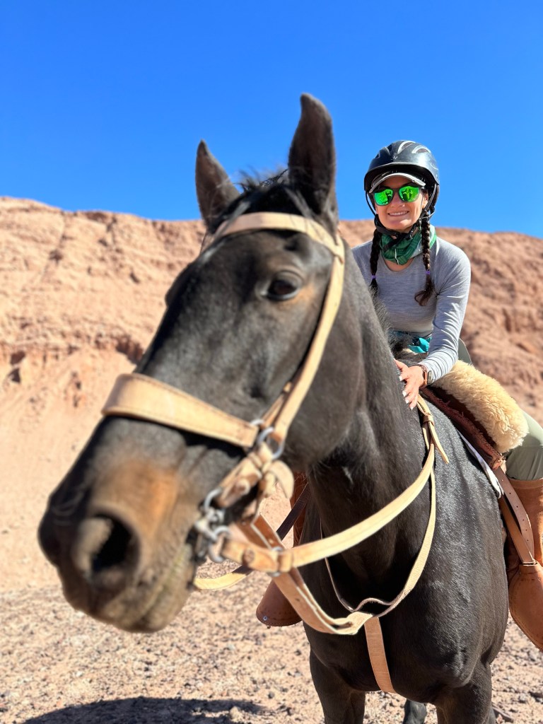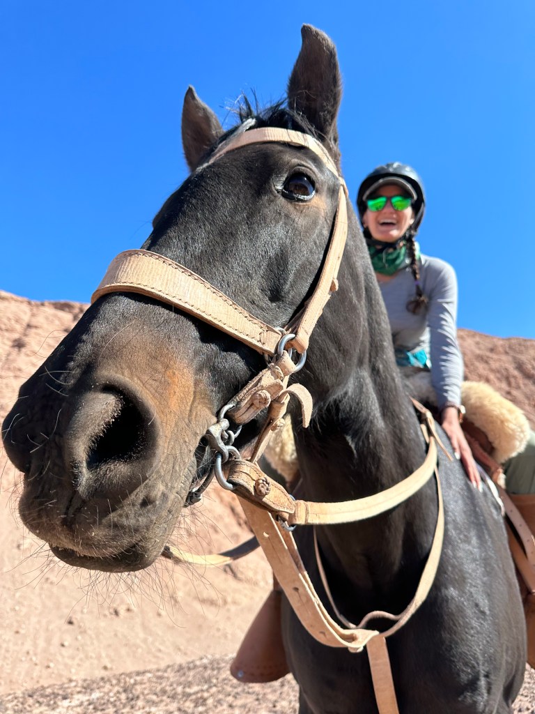 I had heard from multiple guests that the horseback rides at Explora were a little boring and if it weren’t for the conversation with Carolina that would probably be the case, but I was enjoying myself. After riding through residential parts of town, we got to the salt mountain range. Carolina declared it picture time and had me lead Ooh La La to her favorite backdrop. We shared a laugh as Ooh La La managed to find the only living plant in the desolate range to munch on. We couldn’t even figure out where it came from but she was enjoying her little snack. Had she squirreled it in her cheeks like a hamster?! She was a master in front of the camera though and posed beautifully for Carolina to take our picture.