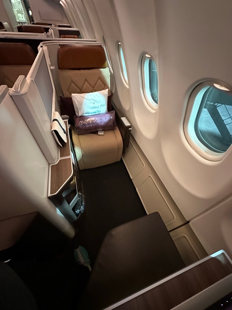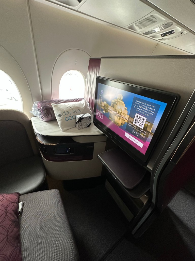 Settling in on board my 5hr 50min flight I chatted briefly with the man in the seat closest to me; he was a mining consultant originally from Australia that now lives in South Carolina. I feel like there’s probably an interesting story to his life but my priority on this flight is sleep! With a 1:45am departure time my plan has been to sleep as much as I can to try to get myself fully into my new time zone; 10 hours ahead of home. Even though it’s all Qatar Airways staff and amenities this is an Oman Airlines plane and not as luxe as the QSuite but it would do.