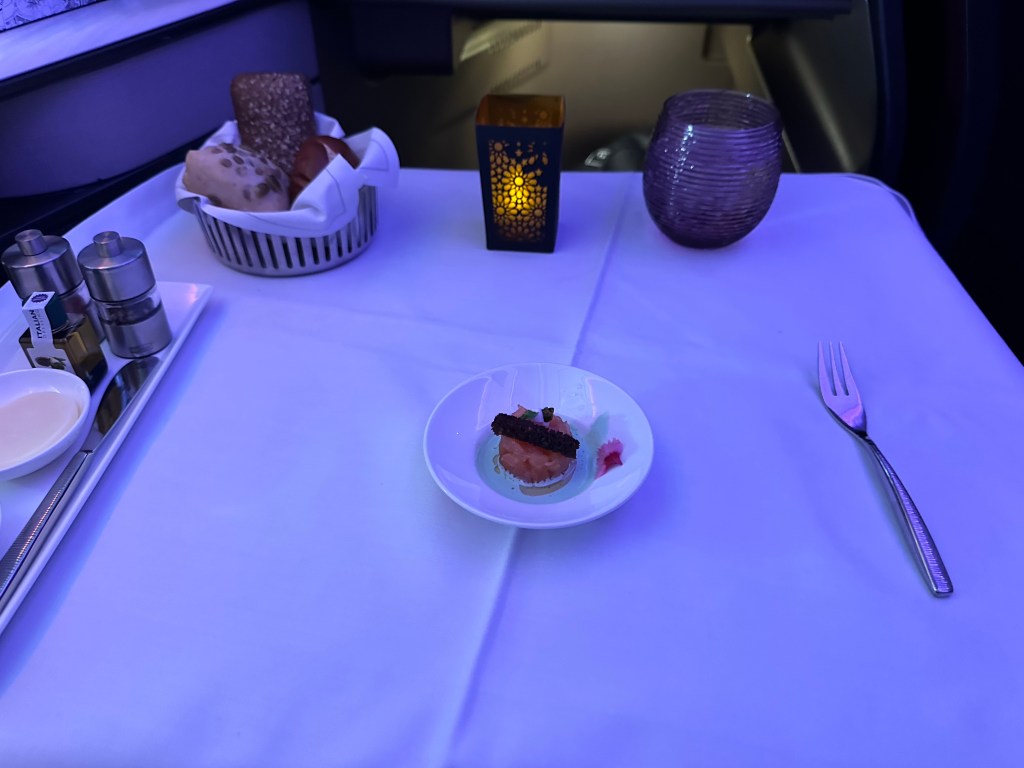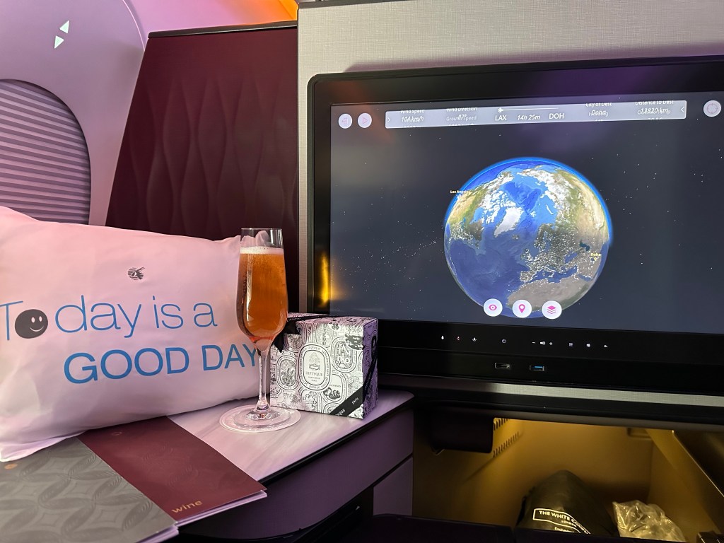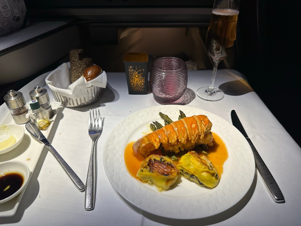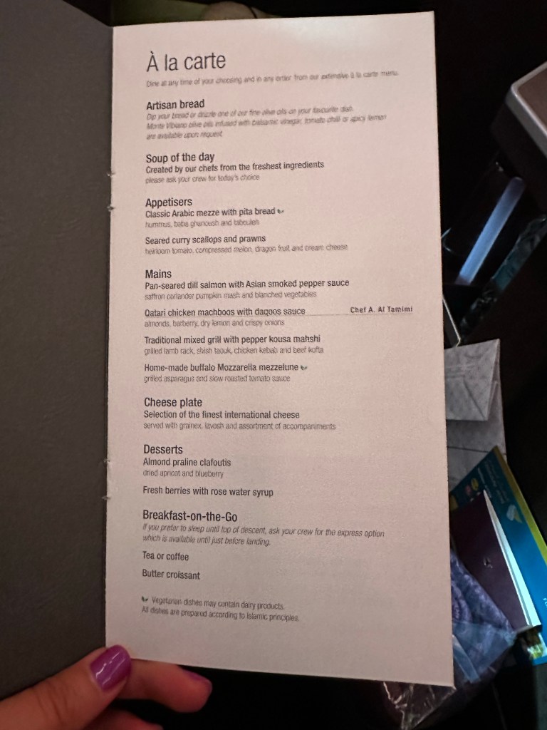 I have been anticipating this flight, my first time flying Qatar Airways and my first time in a QSuite. I was impressed the moment I sat down; with the spacious layout, storage, amenities, and the signature lime mint juice I selected as my welcome beverage. The lime mint juice lived up to all the hype I’ve heard about it and I can’t wait to try to recreate it at home; though I can tell it was heavy on the sugar. Reading the menu made me even more excited; lobster! Lobster tail on an airplane!